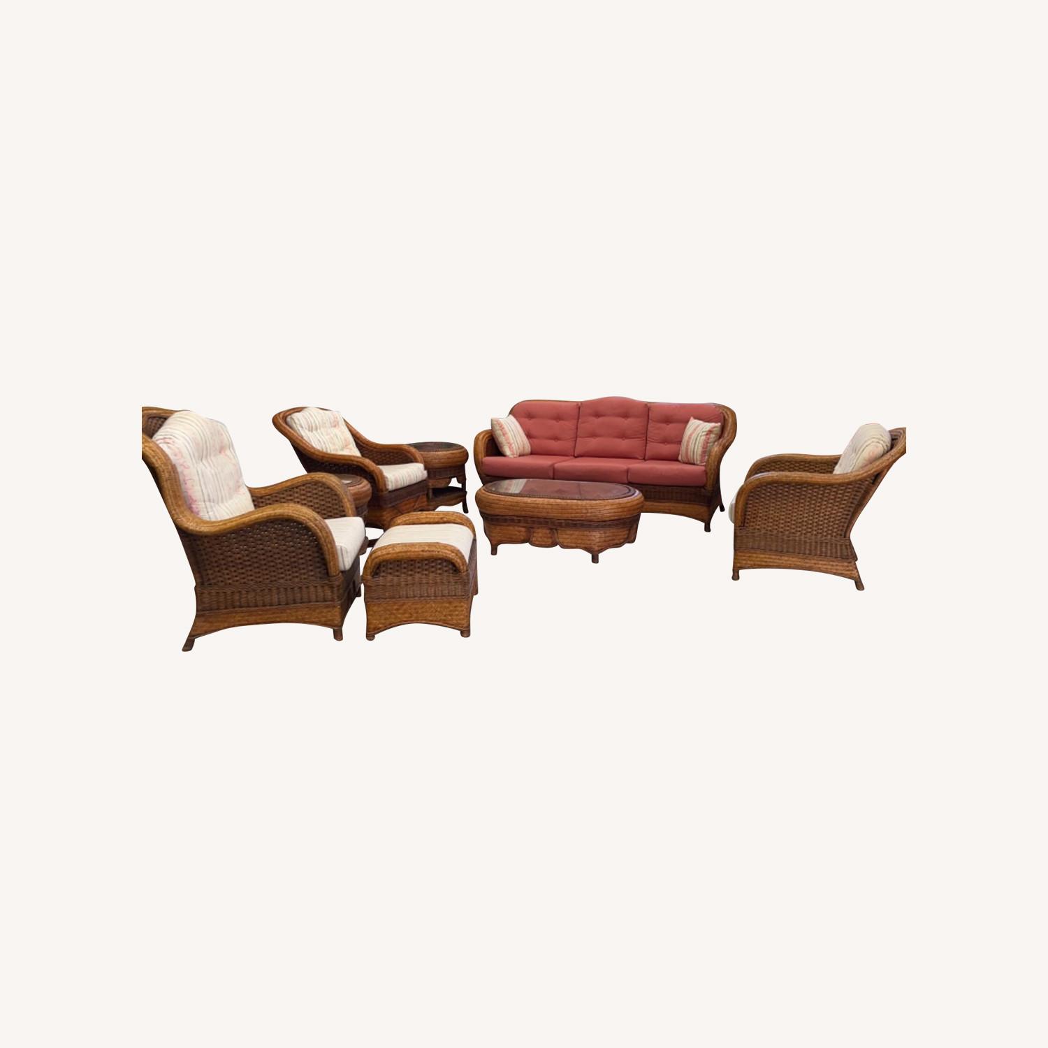 Seller's Notes:Excellent condition, Absolutely nothing wrong with the wicker/rattan, or the cushions no rips, no tears. Three distinctive patterns combined with two tones of the finest quality handwoven antique finished wicker provide an exceptionally rich texture. Plush seat cushions and wide sweeping arms invite your guests to lounge comfortably. Can still be purchased new for over $8000 plus shipping. Includes sofa, 1 armchairs, 1 rocker, 1 wing chair with ottoman, 3 side tables, coffee table