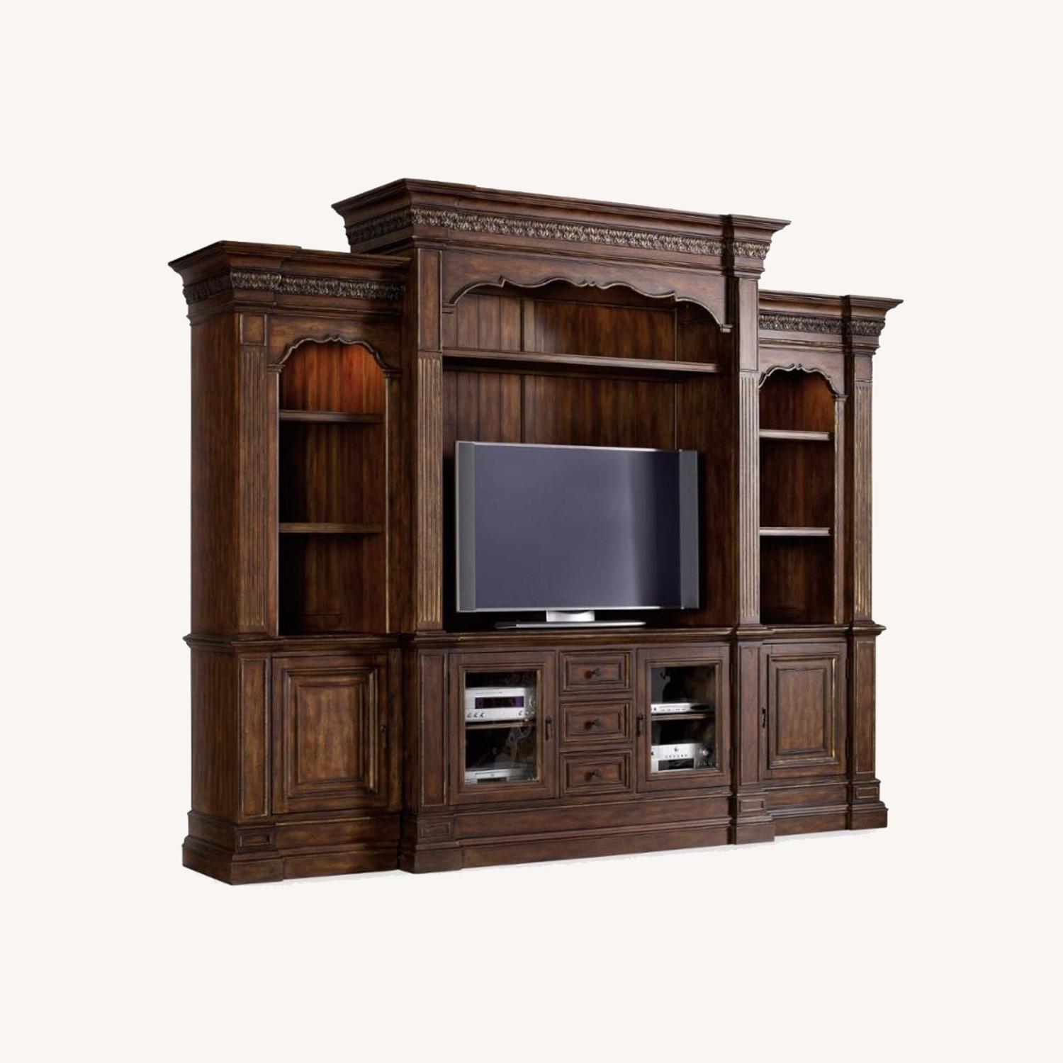 Seller's Notes:Beautiful Hooker Furniture Adagio Collection 4 piece Wall Unit. This piece was located in the main family room. It is a grand staple piece for a room. It is a traditional yet timeless piece that will last for generations to come. We bought this piece 10 years ago from a mom and pop high end furniture store. We still have the matching office set, sofa table and coffee table. We intend on keeping those pieces. There are som scratches mainly where the knobs are located because they got loose. Overall good condition. There are access holes in the cabinets and the side towers. There is also lighting inside the side towers as well.