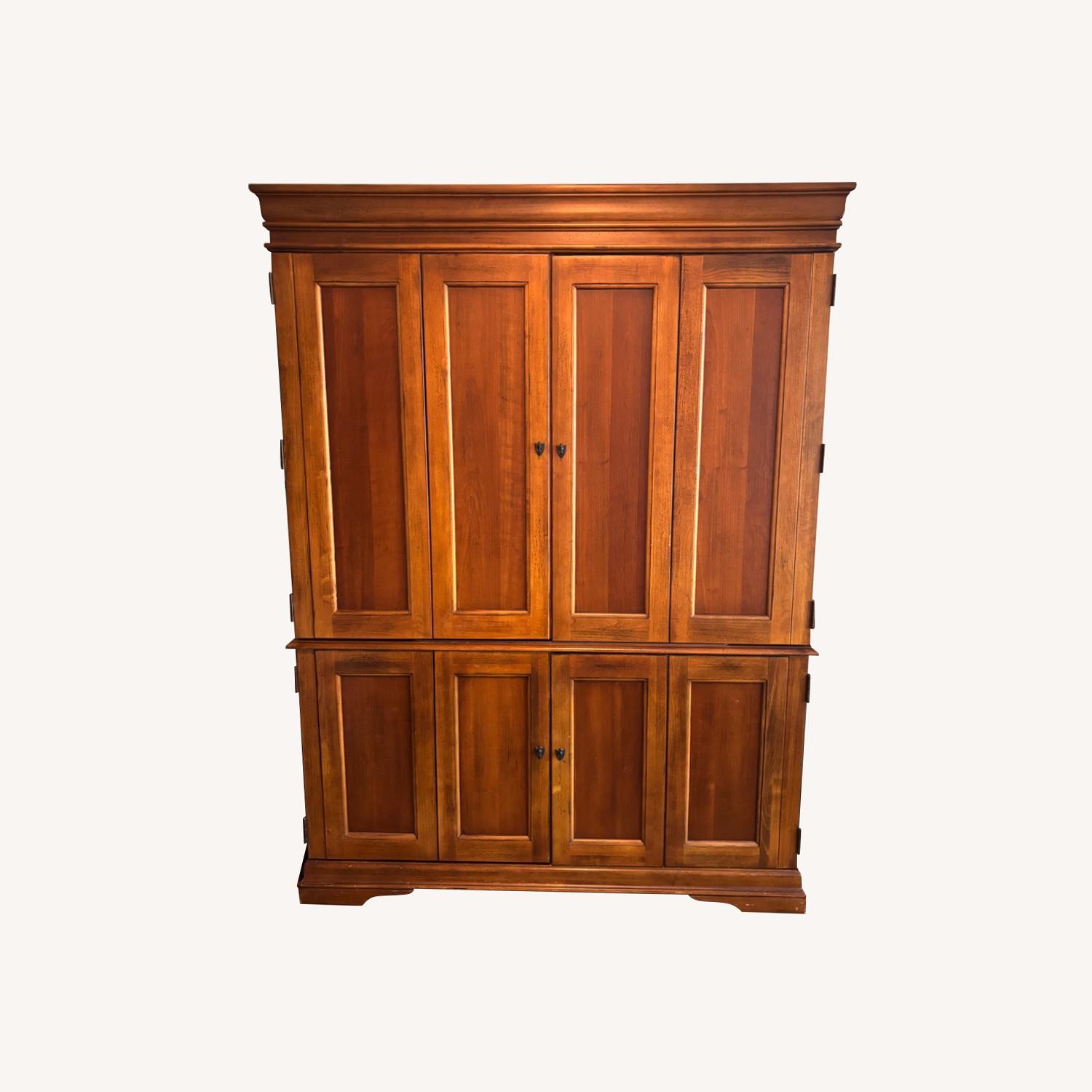 Seller's Notes:Beautiful Hooker office armoire with 2 drawers and 3 slide out shelves. It has a built in light with 2 settings and a built in power strip with 5 outlets on front of armoire. Four doors, two upper and two lower. Good condition with only a few scratches. Armoire is solid wood and comes in 2 pieces.