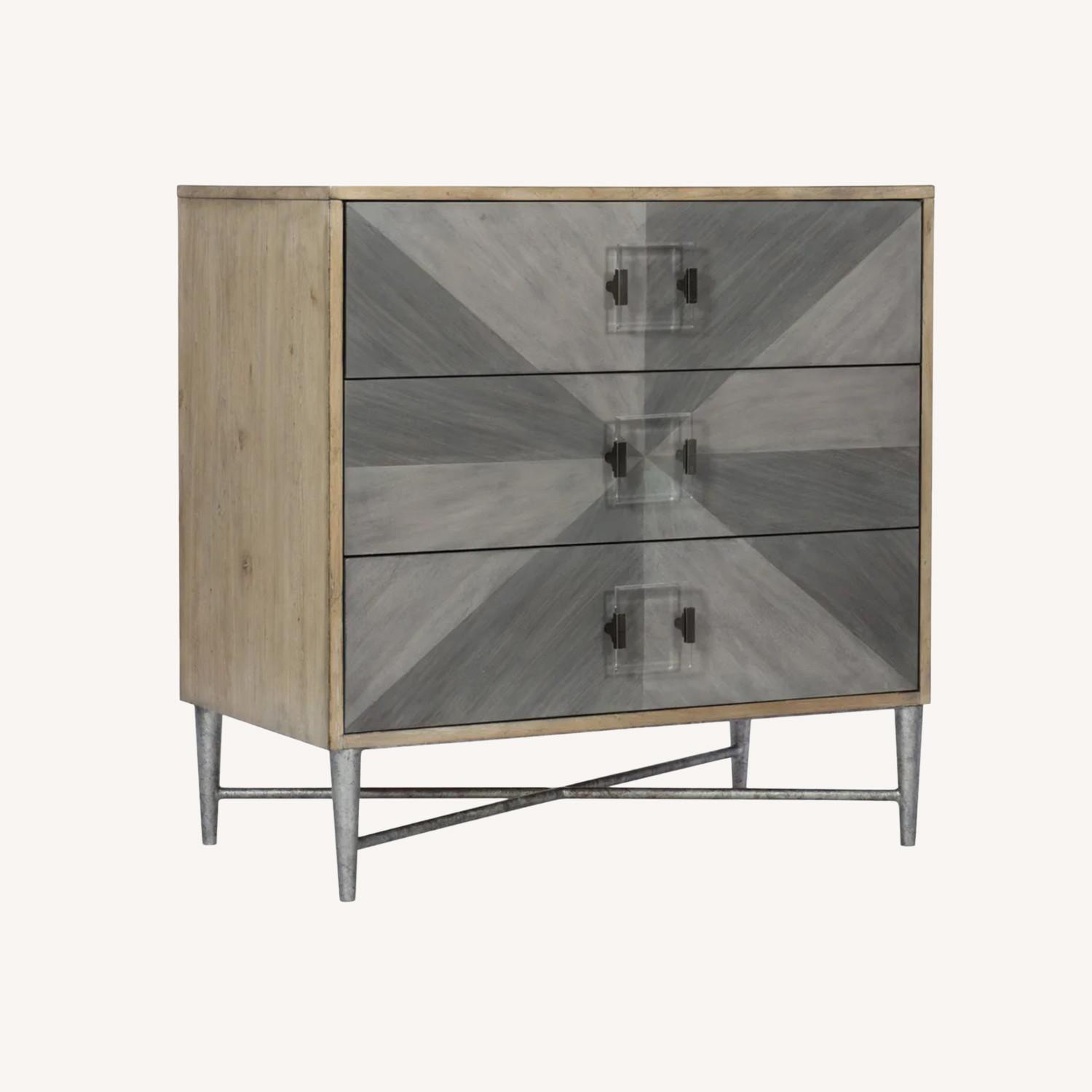 Seller's Notes:Modern yet timeless, the delightful Zulu Chest is crafted of Elm, Maple and Black Walnut Veneer in a contrasting dark gray and light gray decorative pattern. The X-stretcher metal base and dramatic Lucite and Zinc Alloy decorative pull add fashion appeal. Anti-tip hardware