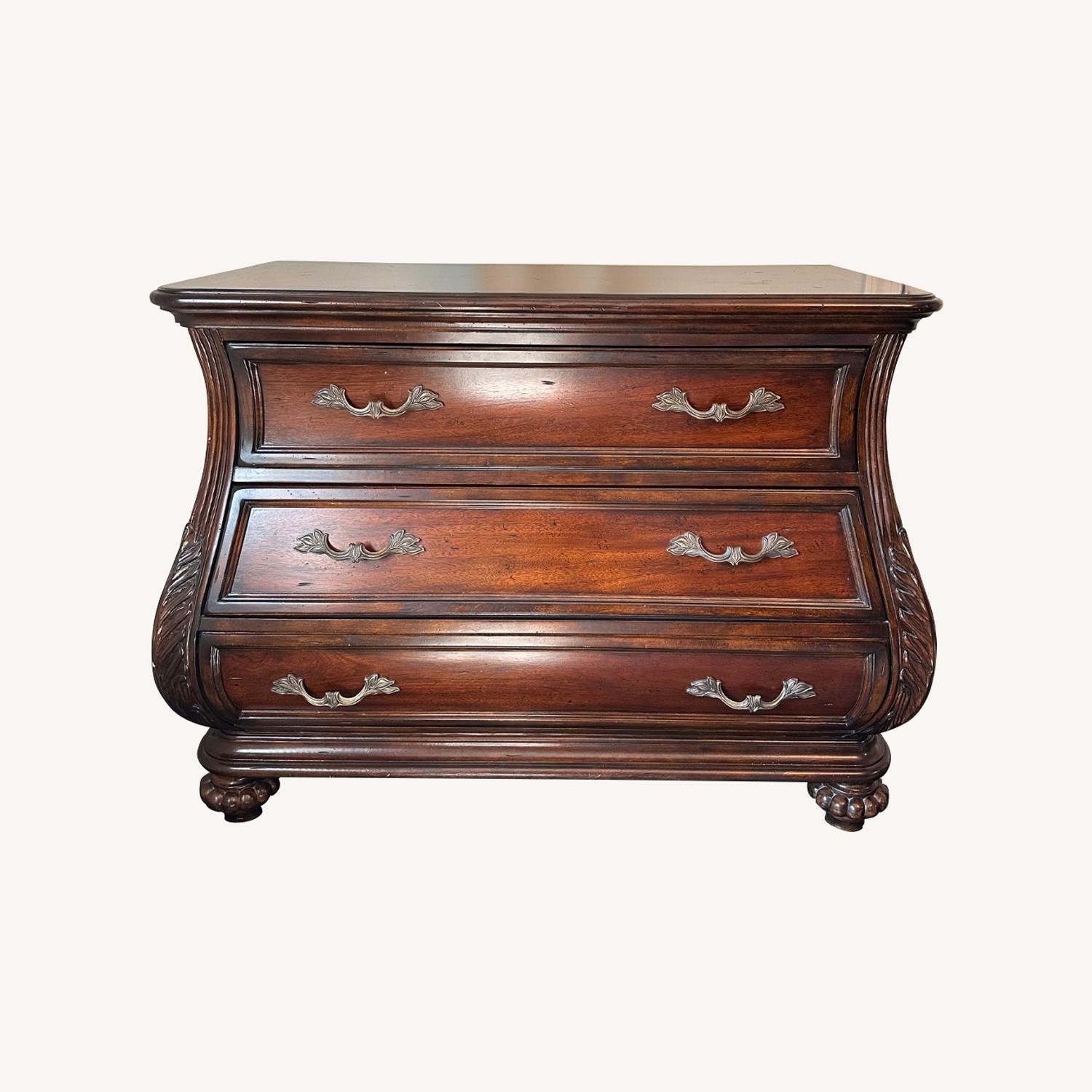 Seller's Notes:Hooker Seven Seas Collection solid wood dresser. Beautiful bombe design with inlaid wood top. Can be part of the full bedroom set of king bed, 2 dressers and 2 nightstands or as a standalone piece.