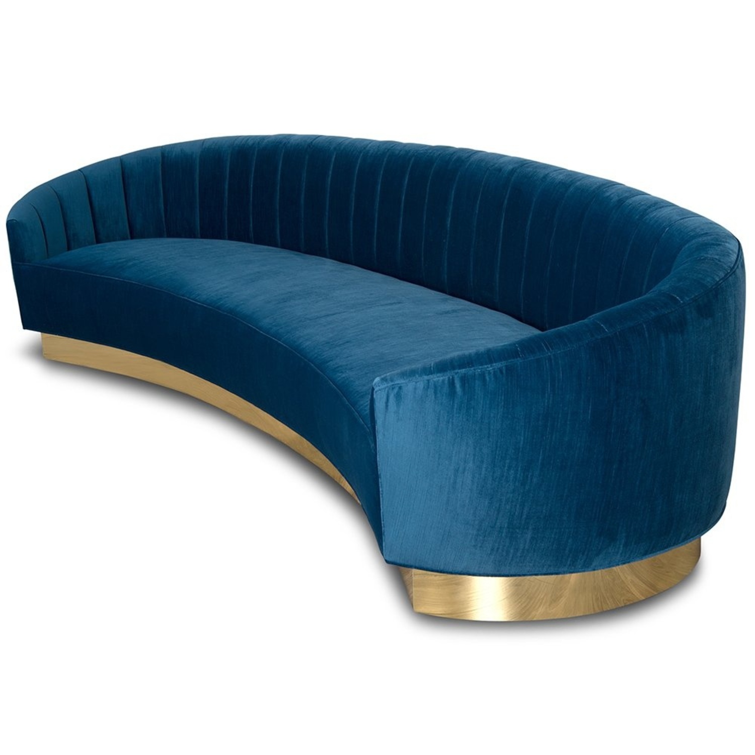 Seller's Notes:Houzz Baxton Studio Milena Upholstered Velvet and Wood Sofa in Royal Blue and Gold Smoke free and pet free home! No visible stains - cambric dust cover has holes - minor scratching on gold base Two pillows included Removable cushion