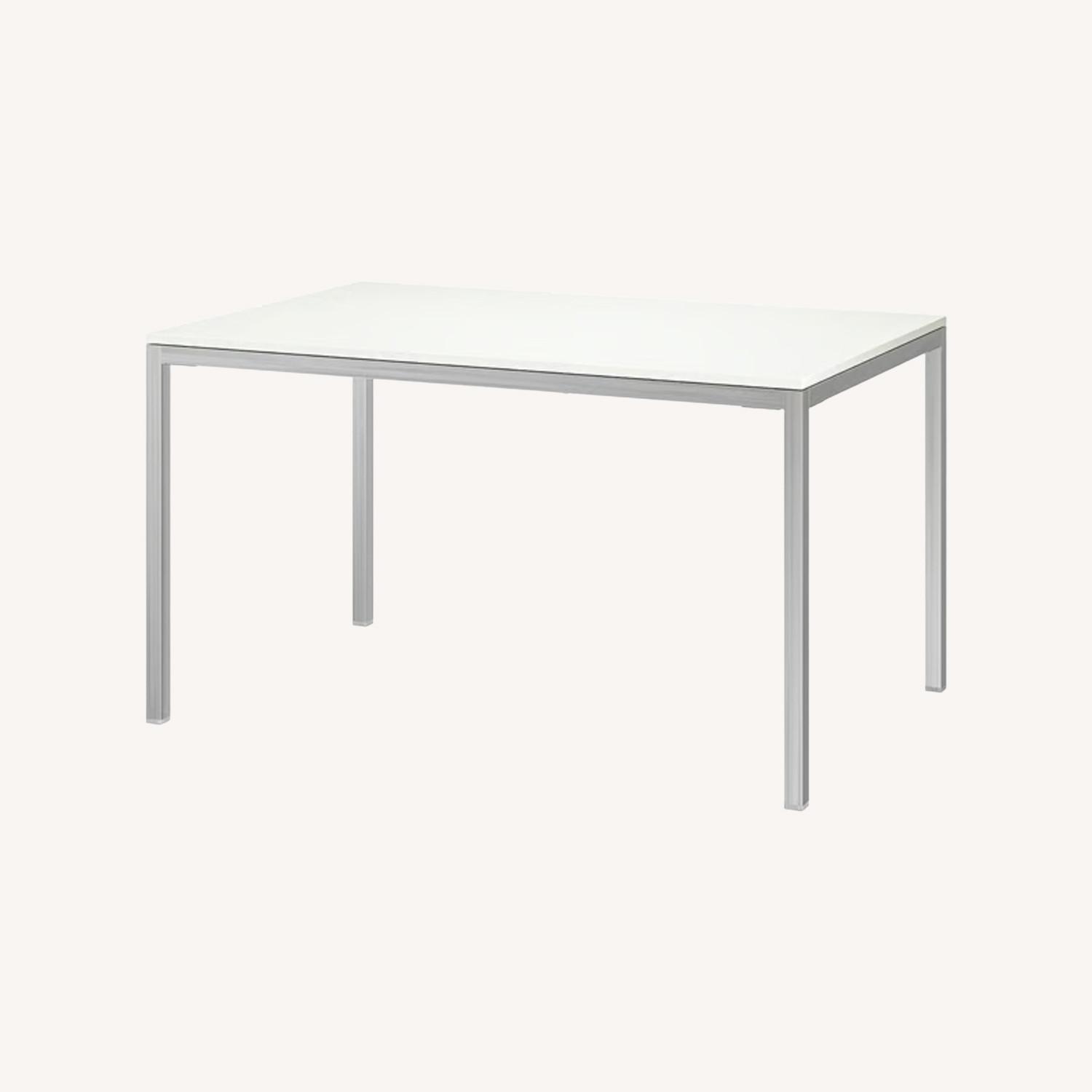 Seller's Notes:Chrome frame with clear/milky white glass top IKEA dining table. Some paint drops and candle wax drops on surface and tape marks on chrome posts near the table top. Even though it has wear and tear it’s not very noticeable unless up close, sometimes I put a table cloth over it.