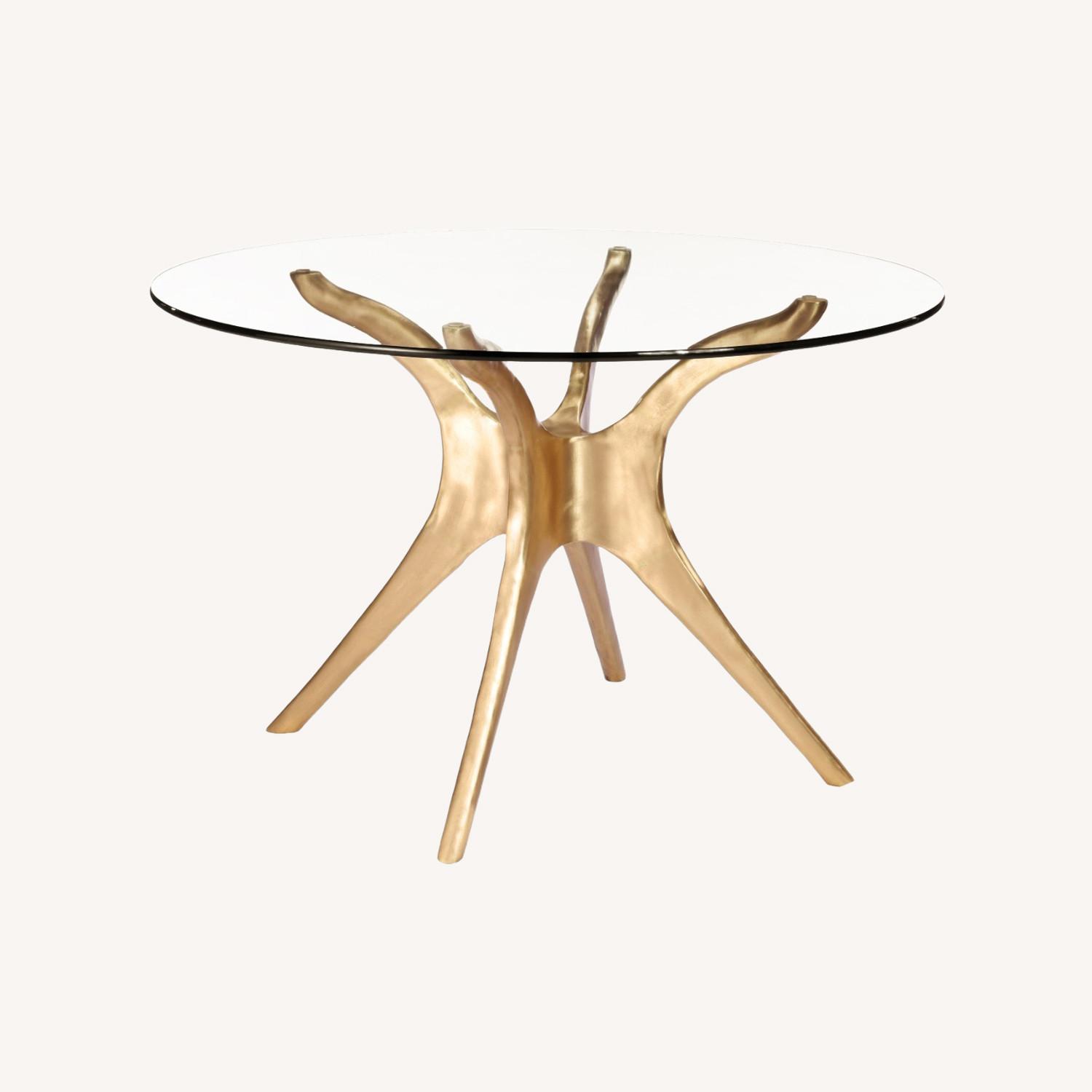Seller's Notes:This dining table showcases forged bronze with a patina finish and a tempered glass top. The handcrafted bronze elements and glass top blend luxury and artisanal design, reflecting a unique, sophisticated style.