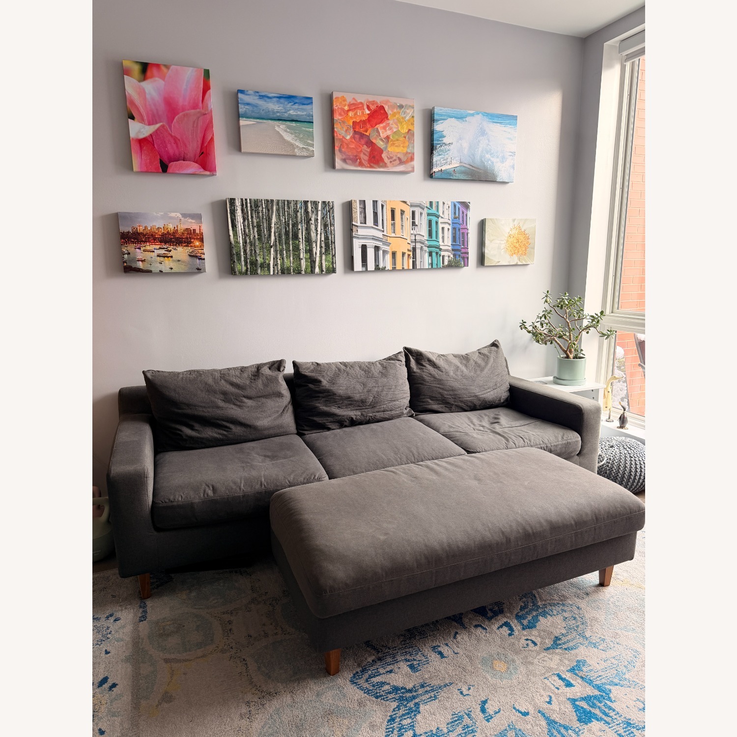 Seller's Notes:Interior Define custom made so the length is 99" where 3-4 people can sit comfortably on the couch at the same time. The fabric is Performance Knit so it is easy to clean. Very good condition. Has been in a no smoke, no pet apartment. Also selling oversized Ottoman - Length: 55" x 27"