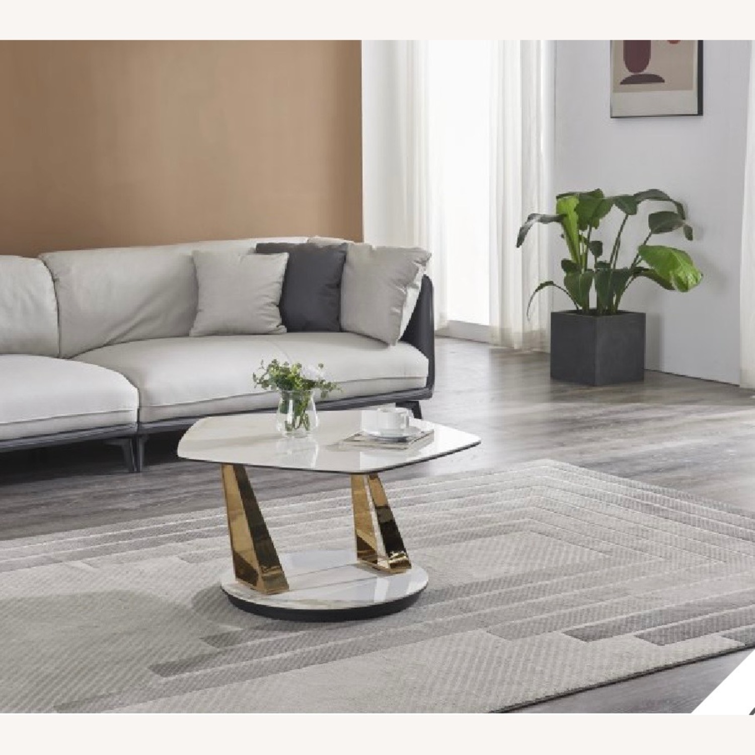 Seller's Notes:The Orleans nested coffee table set is an absolutely mouth-dropping collection, sure to stun all those that enter your luxurious space. The Orleans Collection features a glossy white ceramic with brown veins throughout, paired with polished brass bases that further the elegance of the set. The coffee table also features a rotary design, allowing a second shelf to unfurl from underneath, exceeding all expectations.