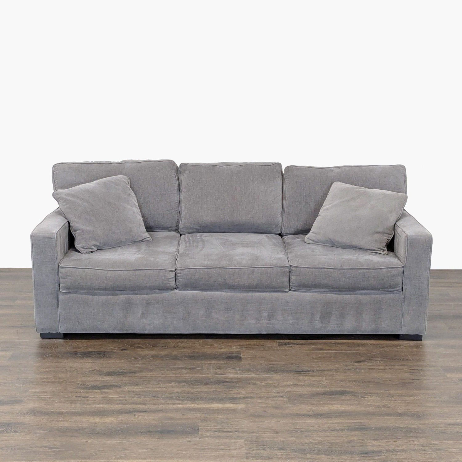 Seller's Notes:This Jonathan Louis sleeper sofa features a sleek gray fabric and a modern, boxy design. It comes with plush back and seat cushions for comfortable seating and includes two matching pillows. Perfect for any living room or guest space, this versatile sofa easily converts into a bed for overnight guests. Sturdy construction ensures long-lasting use.