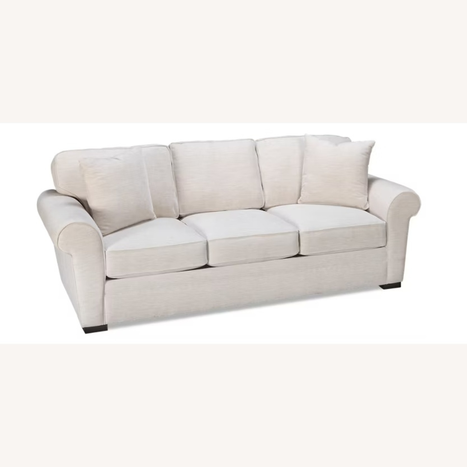 The Jonathan Louis Choices 3 Seat Sofa brings home a regal, luxurious and inviting flair. Showcasing sink-in style box seat cushions and supportive back, this home furniture comes with rolled arms for a classic look. Sturdy block feet complete this transitional-style sofa that includes two toss pillows for added comfort and style. Custom-order fabrics are available.
