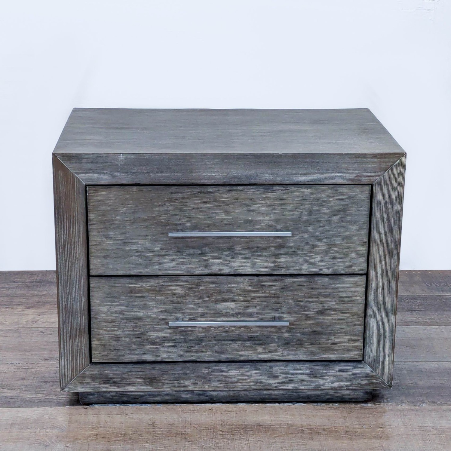 Seller's Notes:The nightstand has a wire-brushed textured finish and a floating plinth base. It's made from solid + manufactured pine wood with chrome handles. It has 2 spacious, felt-lined drawers, removable chrome handles, and a USB port in back.
