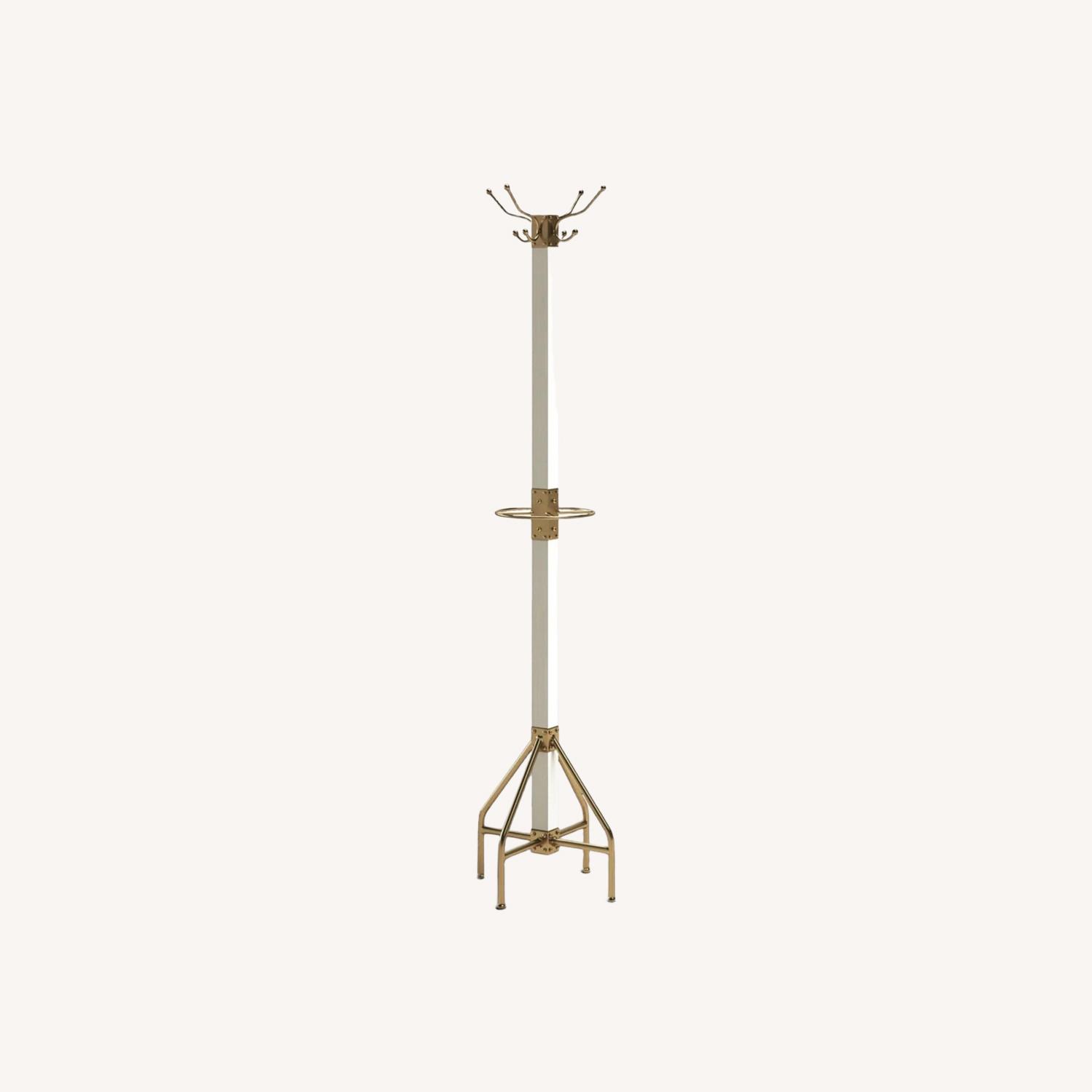Seller's Notes:This coat stand arrived slightly damaged from Joss and Main, but I kept it because this color is sold out and has been for some time. I am choosing to sell it now because I want to install a wall rack instead to free up some floor space in my office waiting room. It is solid and beautiful and the small scratch is easily hidden by turning that side towards a wall. From the Joss and Main website: Solid mango wood and iron come together in this coat rack to create a helpful coastal farmhouse accent in your entryway. The base is made from metal and supports the center wooden rod with a finish for a hint of rustic flair. A center ring gives you a spot to hang your umbrellas, while four C-shaped hooks can catch your coats, scarves, and hats. It measures 74" tall and 18" wide, so it won't take up too much room in your foyer or mudroom.