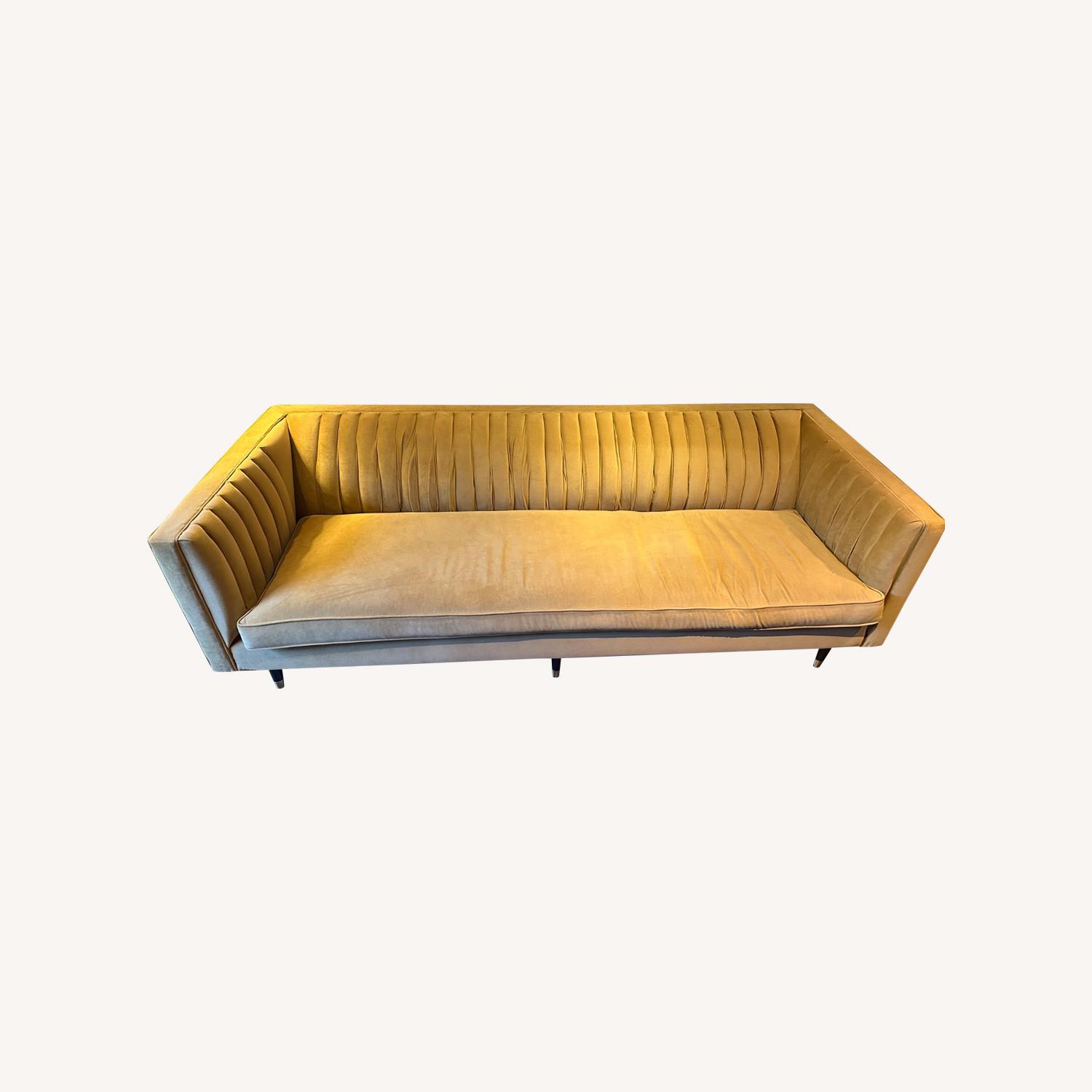 Seller's Notes:This couch has a tufted back and bench seat, which means it can seat 4 adults side-by-side. It is in good condition—the reason we are willing to part with it is because we are having a baby and need to turn our TV room into a nursery. We bought this sofa from Joybird in 2021. The fabric is “sorrento marigold” and the wood stain is mocha.