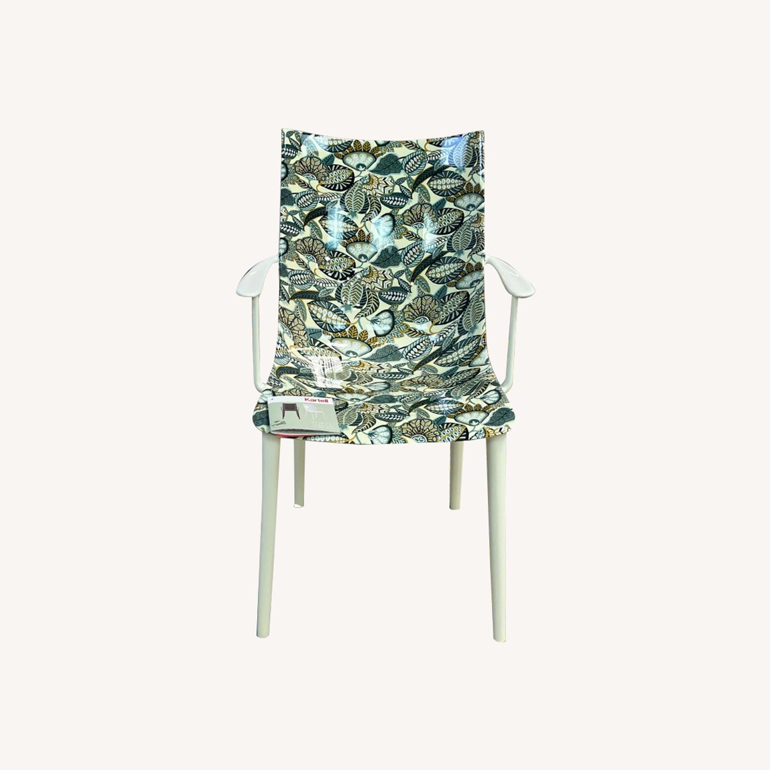 Philippe Starck elevates us to new heights with the H.H.H. - HER HIGHEST HIGHNESS chair. With unparalleled elegance and graphic impact, H.H.H. defines the very essence of the human interacting with it, compelling one to take a stance. It transcends the mere notion of sitting, transforming every moment spent upon it into one of true majesty. The frame is crafted from recycled material, and the seat is available in various finishes: recycled leather with green tanning treatment, in black and tan colours, eco-friendly texture sourced partly from recycled material and partly from renewable sources in black and tobacco colours, and in super glossy finish in white, black, burgundy, rust, mustard, blue and green. But H.H. rises above the simple practical functions of a chair, becoming an emblem of style that enchants and inspires anyone who approaches it thanks to the Kartell x Liberty edition, upholstered in six Liberty fabrics featuring lively floral prints. Faithful to its pioneering role in the search for new and different forms of technological innovation, Kartell has also decided to take a further step in this direction, experimenting with a new high-tech industrial printing process called “graphic impression”. This technique will be used to produce 4 floral and geometric patterns in different colour versions.