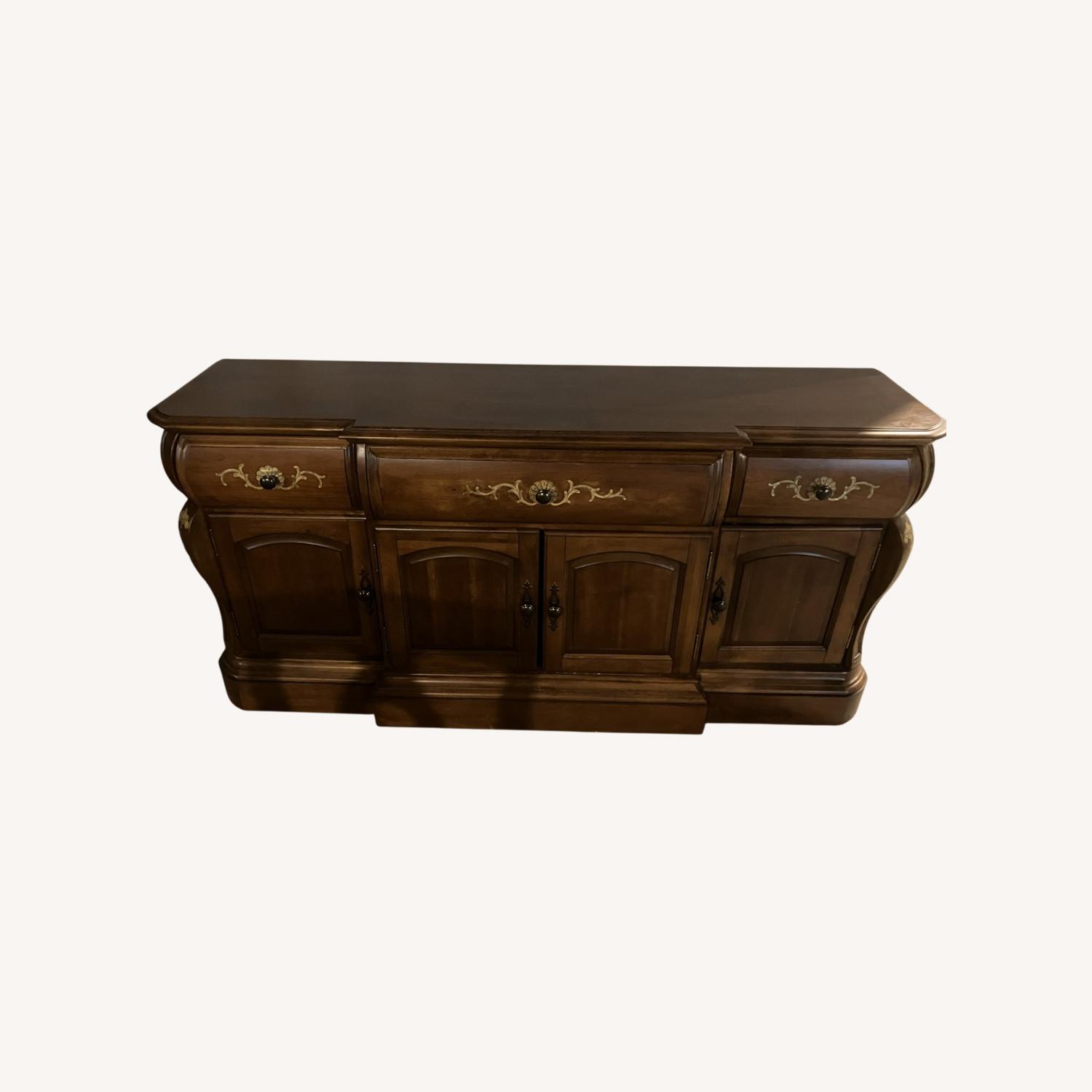 Seller's Notes:This is an all-wood armoire which comes in two pieces. The bottom is a cabinet with loads of storage which includes cabinet doors and three drawers with felt on their bottoms. The top is a cabinet with glass shelving and lighting. Each piece has inlay designs on it. It is in excellent condition. Also, we are willing to sell just the bottom if that is all you need.