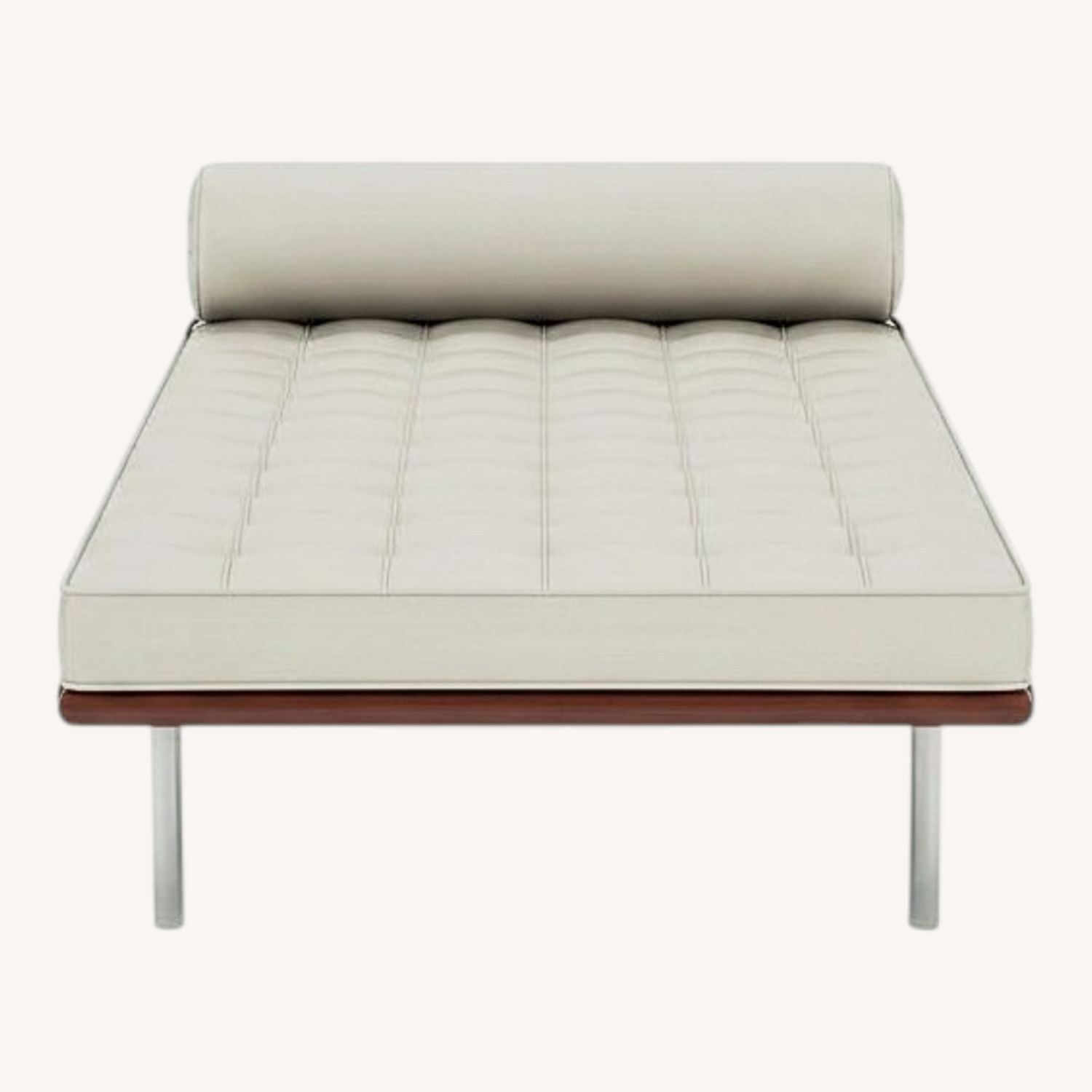 The Barcelona Couch (1930) by Ludwig Mies van der Rohe continues to endure as an icon of modernism and master craft. It’s upholstered using a single Spinneybeck cowhide and supported by an African mahogany sapele hardwood frame and stainless steel legs. To create the deep, precise tufting, individual panels of leather are cut, hand-welted and hand-tufted. The Barcelona Couch is a registered trademark of Knoll, Inc., this is the authentic Barcelona Couch by Knoll.
