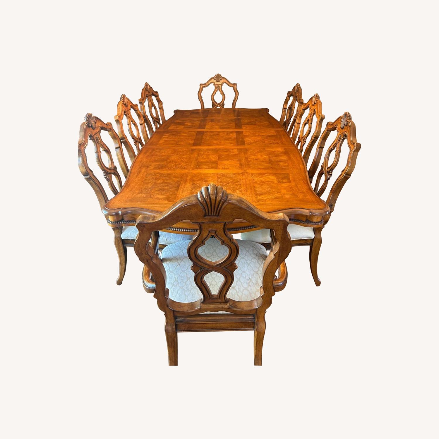 Seller's Notes:For Sale: Traditional Dining Set – Table, 8 Chairs & China Cabinet Beautiful, solid wood dining table with 8 chairs (2 armchairs), plus a matching glass-front china cabinet with interior lighting. All in great condition – sturdy, clean, and well cared for. Perfect for formal dining or large gatherings.