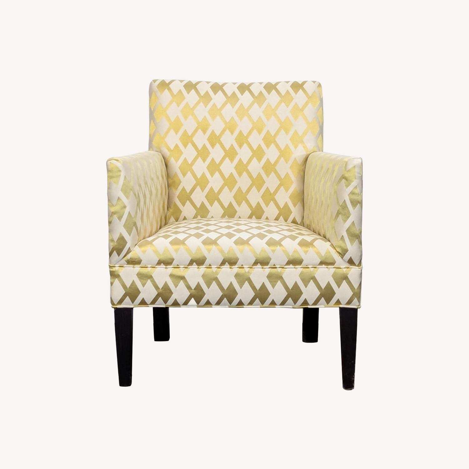 Seller's Notes:This stylish lounge chair features a bold gold and cream diamond pattern upholstery, offering a modern look perfect for any living space. It has sturdy dark wooden legs and comfortable armrests, making it a great choice for relaxing or reading. Add a touch of elegance to your lounge with this eye-catching accent chair.