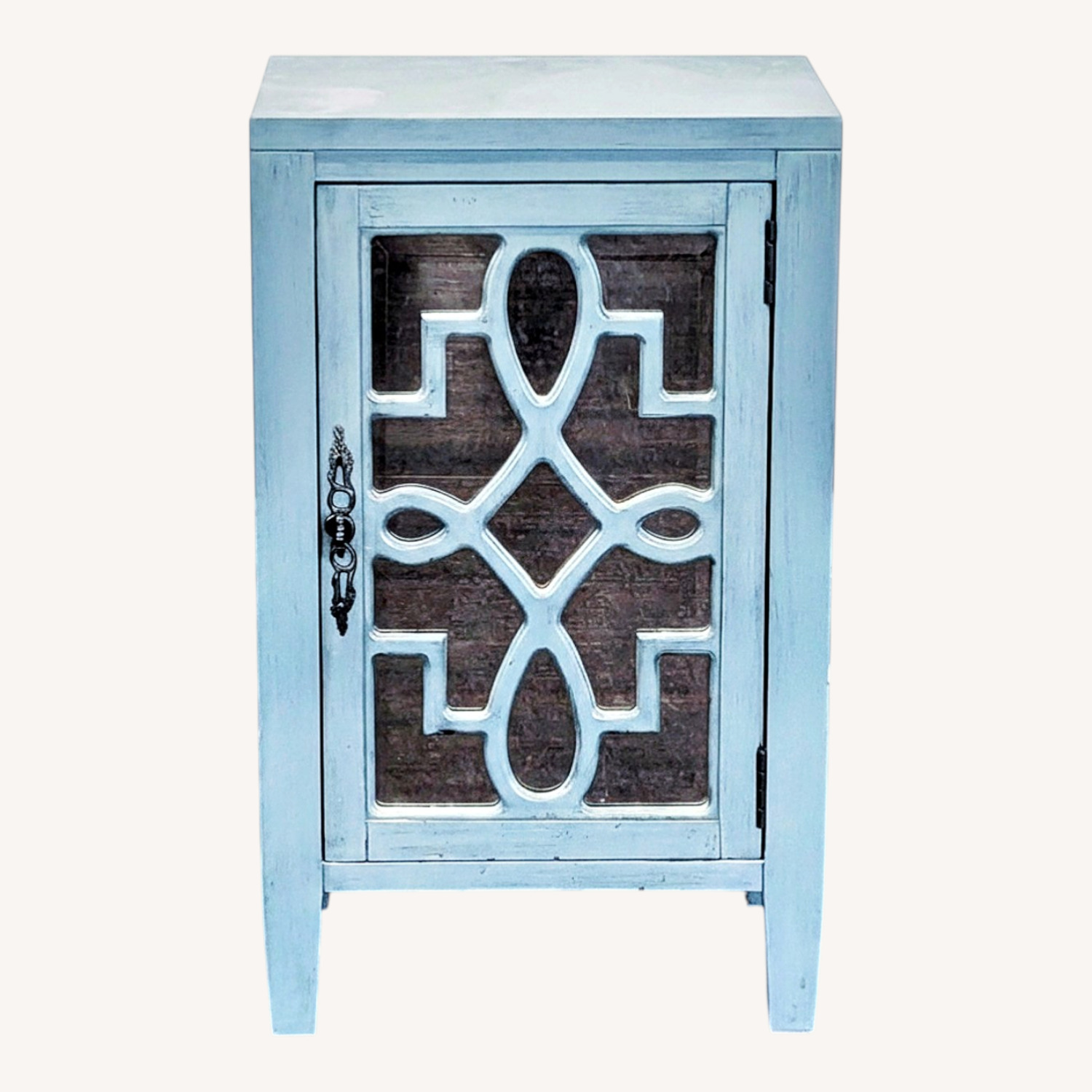 Seller's Notes:The Leighton accent cabinet has a hand-painted turquoise finish. The antique mirrored door features and open scroll fretwork overlay. Behind the one door is one fixed shelf and wire management on the back panel allowing you to store your media devices.
