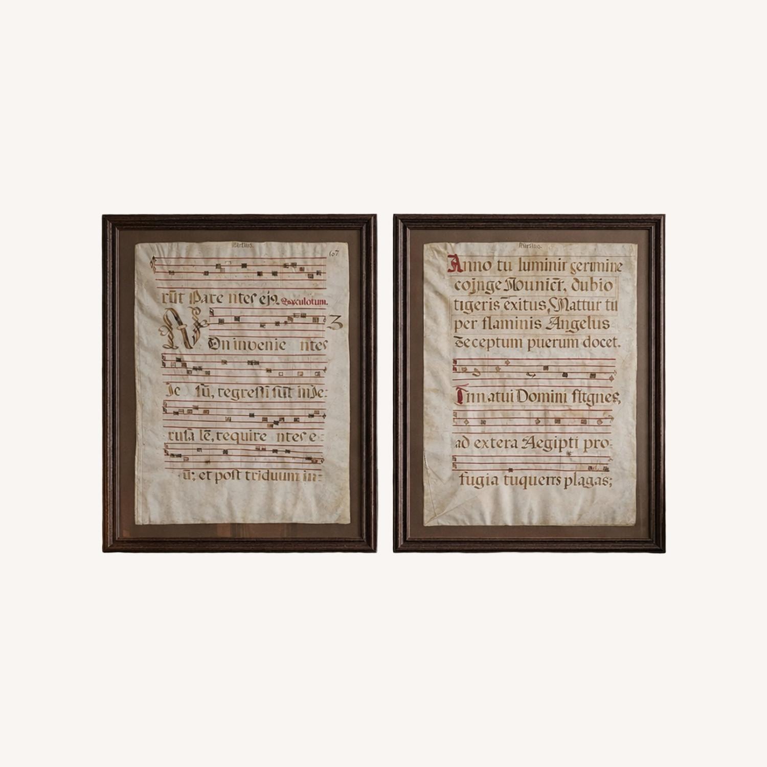 Seller's Notes:Two large Latin Music Wall Hangings on Parchment paper. Beautifully matted and framed. I have no idea what these say, but they are unusual and quite gorgeous! In excellent condition! Each measures 33" H X 26" W