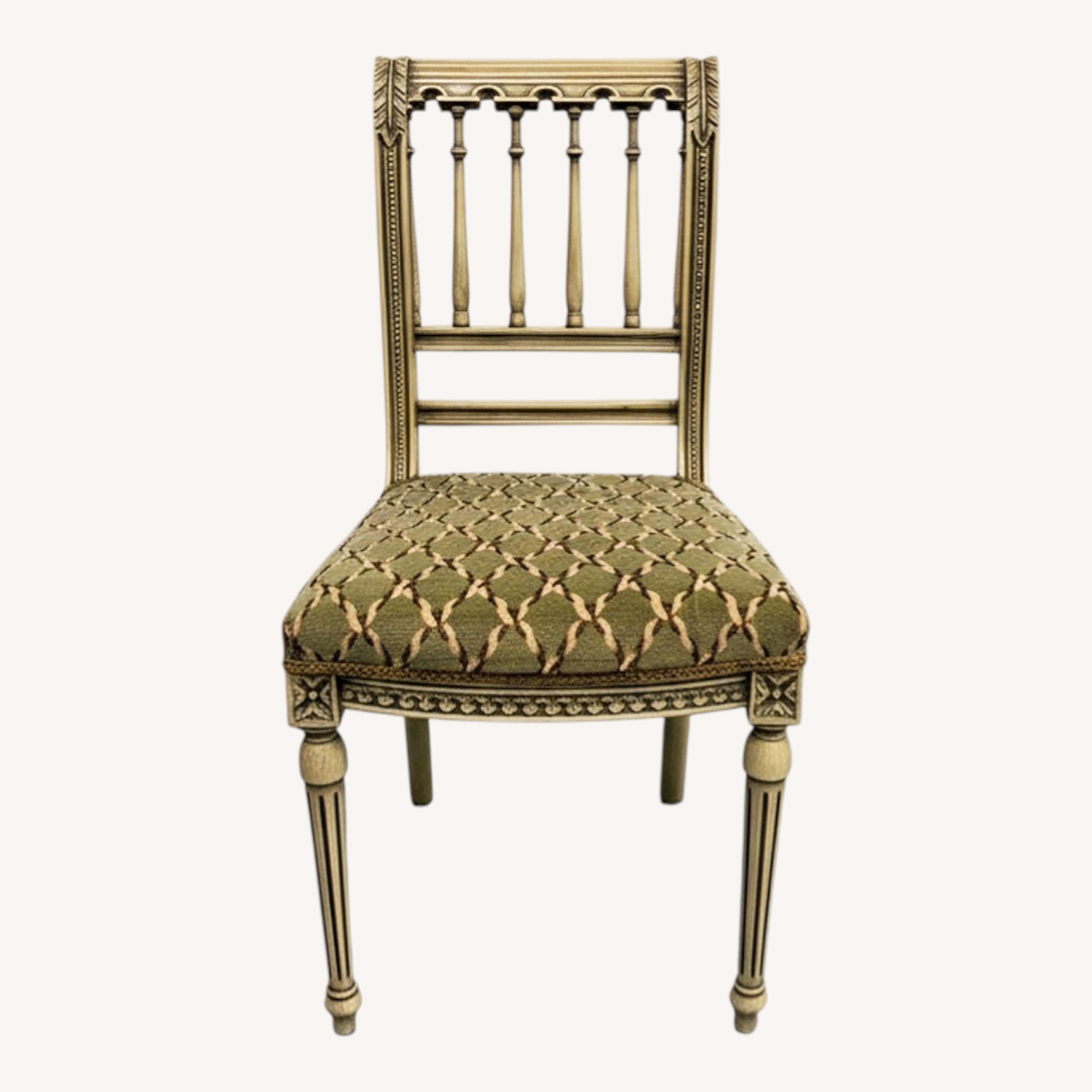 Seller's Notes:19TH CENTURY FRENCH LOUIS XVI Style side Chairs Featued a Distressed Withe Painted Wood Frame and aPatterned Upholsterd seat.