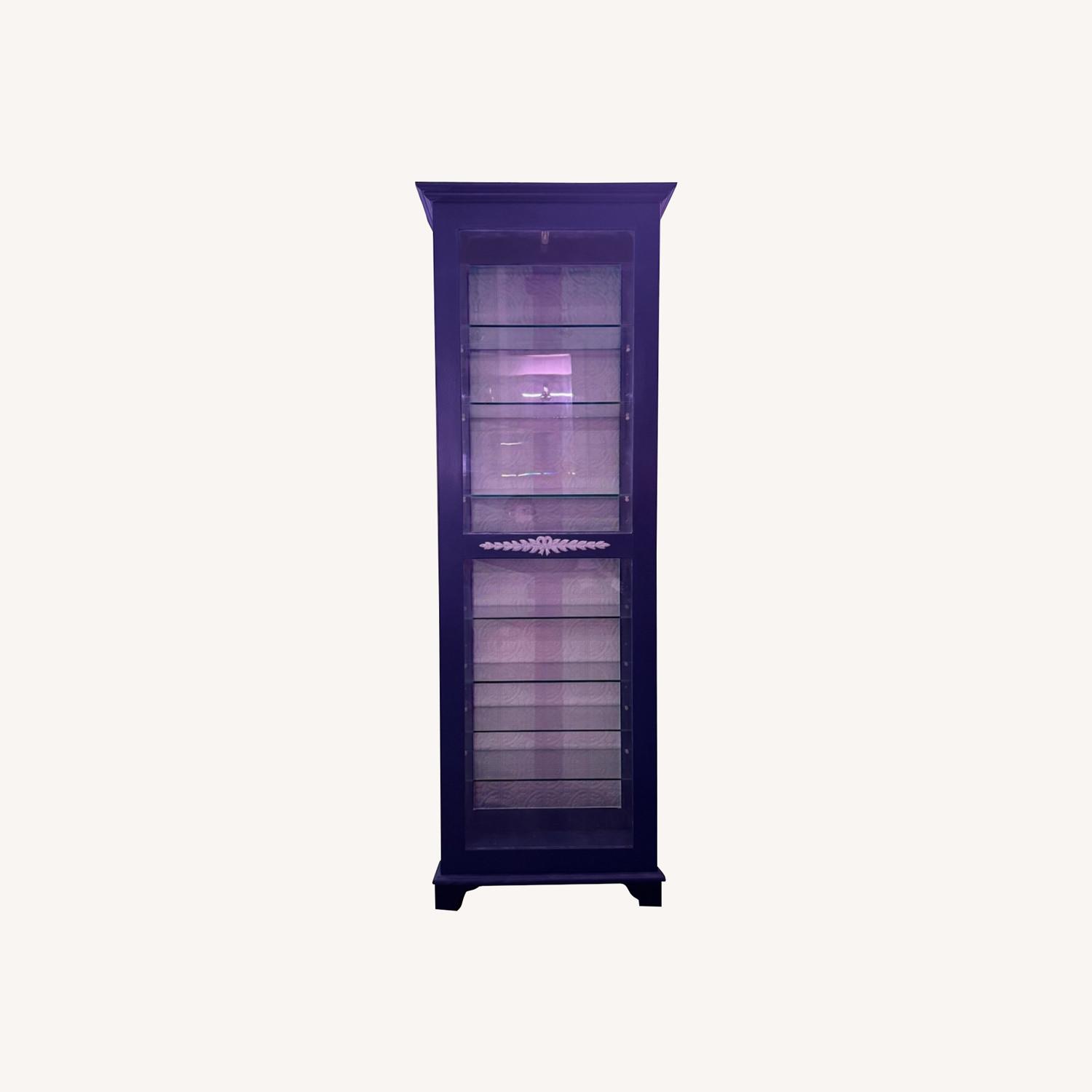 Seller's Notes:Available is this elegant Lighted Curio Cabinet! Send me a message! This is a tall and narrow display cabinet with glass doors and internal glass shelving. This cabinet is mostly used to showcase collectibles and decor while protecting them from dust. The frame is finished in Blue and sealed with white wax and has 8 shelves and 4 doors (2 on each side). It is equipped with 8 adjustable tempered glass shelves which allow light to pass through and provide flexible display space. A decorative emblem is visible on the front divider between the upper and lower glass window to give it that special touch. The inside also has LED lightning for brighter, whiter, long-lasting light to illuminate your collectibles. ✨ Refinished with Professional Paint. ✨ 8 Tempered Glass Shelves & 4 Glass Doors ✨ Accented with White Wax on the Inside ✨ Wallpaper Design added on the background ✨ Sealed for Durability ✨ Measurements: 24” L x 13” W x 72” H ⭐️⭐️ Please take into consideration that all our furniture pieces are secondhand. Which may result in them having minor imperfections consistent with their age. They have been refinished and restored to best of our abilities. The imperfections that still remain make them a part of their history.⭐️⭐️