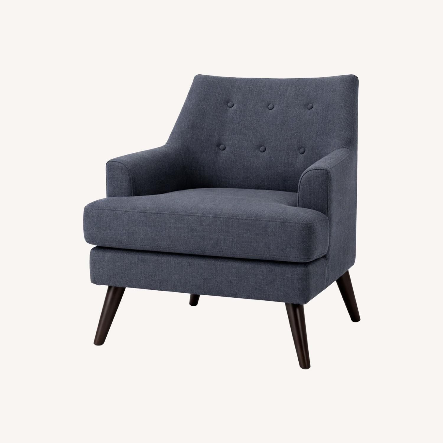 Seller's Notes:This mid century modern looking chair is a wonderful addition to any decor . This Blue fabric that has been scotchguard protected is a fine bargain for the in style shopper .