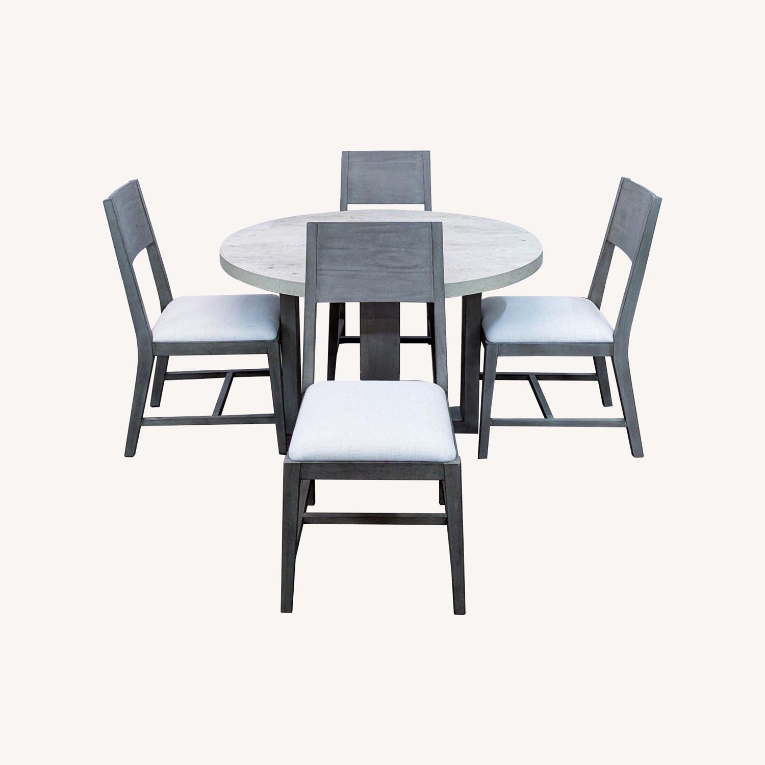 Seller's Notes:This dining set features a kitchen-grade concrete laminate top that is built for spill and heat resistance. Paired with reclaimed pine, the elements boast distressed characteristics to give them a natural, organic look with supportive chairs with upholstered seats.