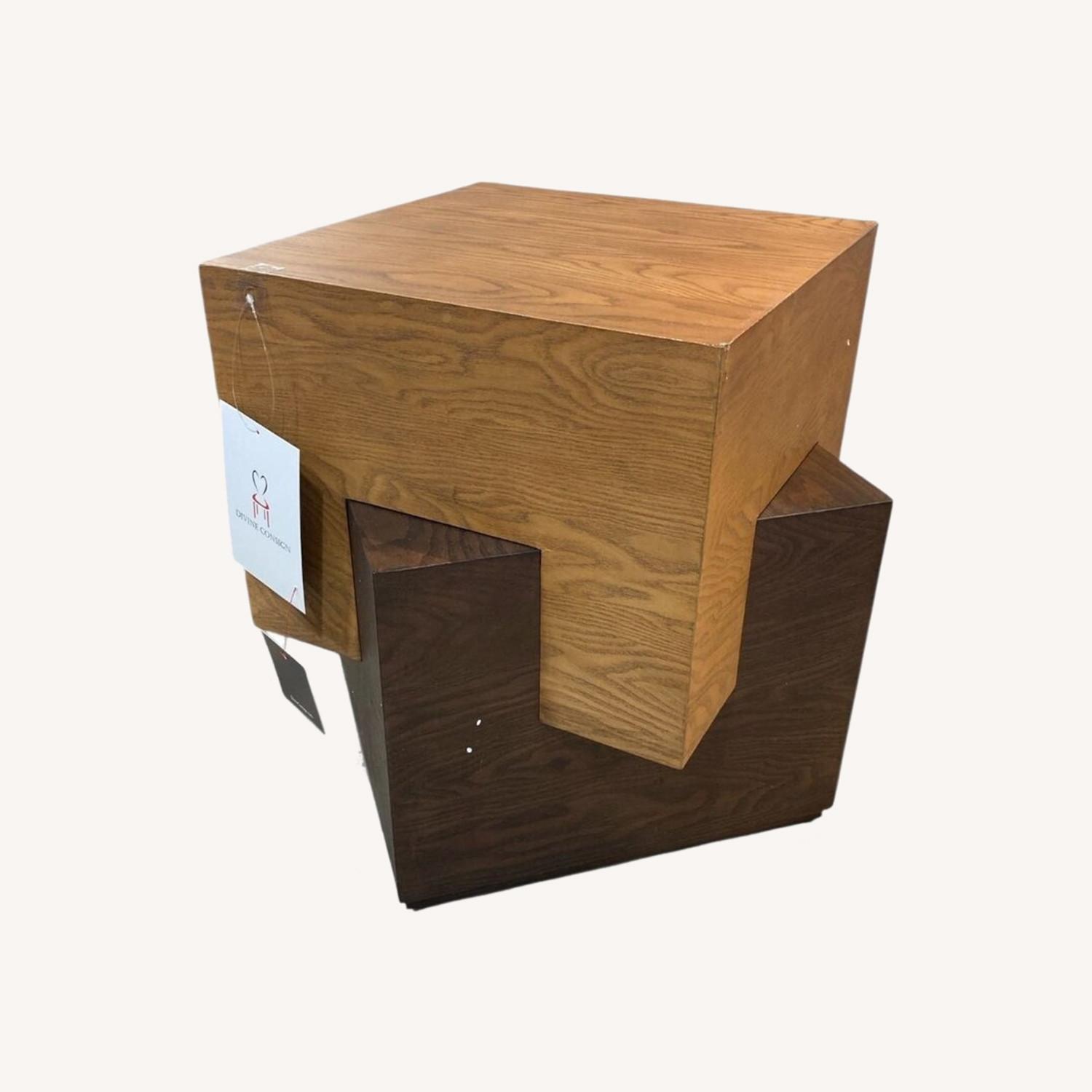 Seller's Notes:The Brayden Side Table turns an ordinary end-table into a sculptural accent piece, offering both function and artistry. Its design features two interlocking blocks of wood, stacked at an angular offset in contrasting finishes — a joinery detail that draws attention to the natural grain and craftsmanship. The result is a bold yet refined silhouette that adds texture and visual interest to a room. This side table brings warmth and organic character to modern interiors. With its wooden construction and artful geometry, it can ground your living space while still acting as a statement piece whether placed beside a sofa, lounge chair, or bed. The overall look is contemporary and minimal, but with enough presence to complement both minimalist and eclectic decor styles.