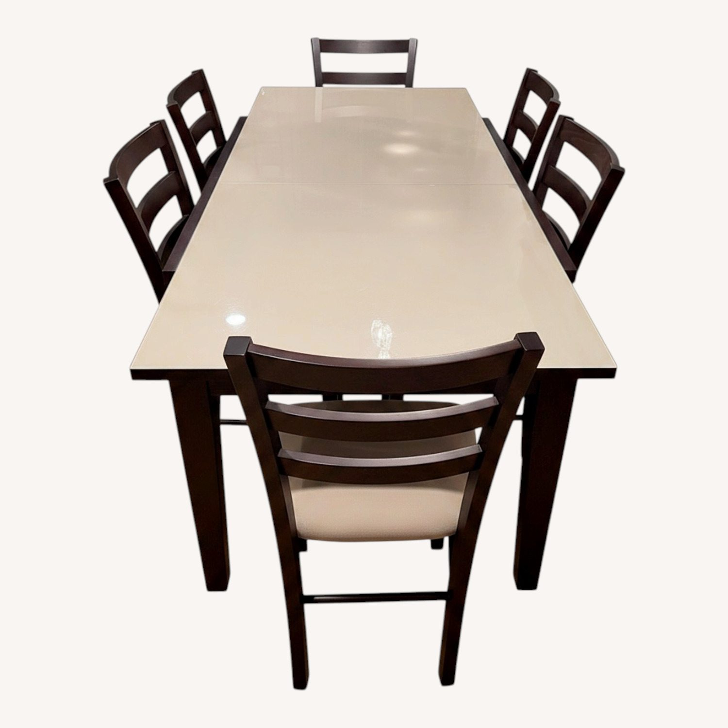 Seller's Notes:Beautiful dining table set originally purchased from Macy’s (2010), includes table with self storing extension leaf and 6 matching chairs.