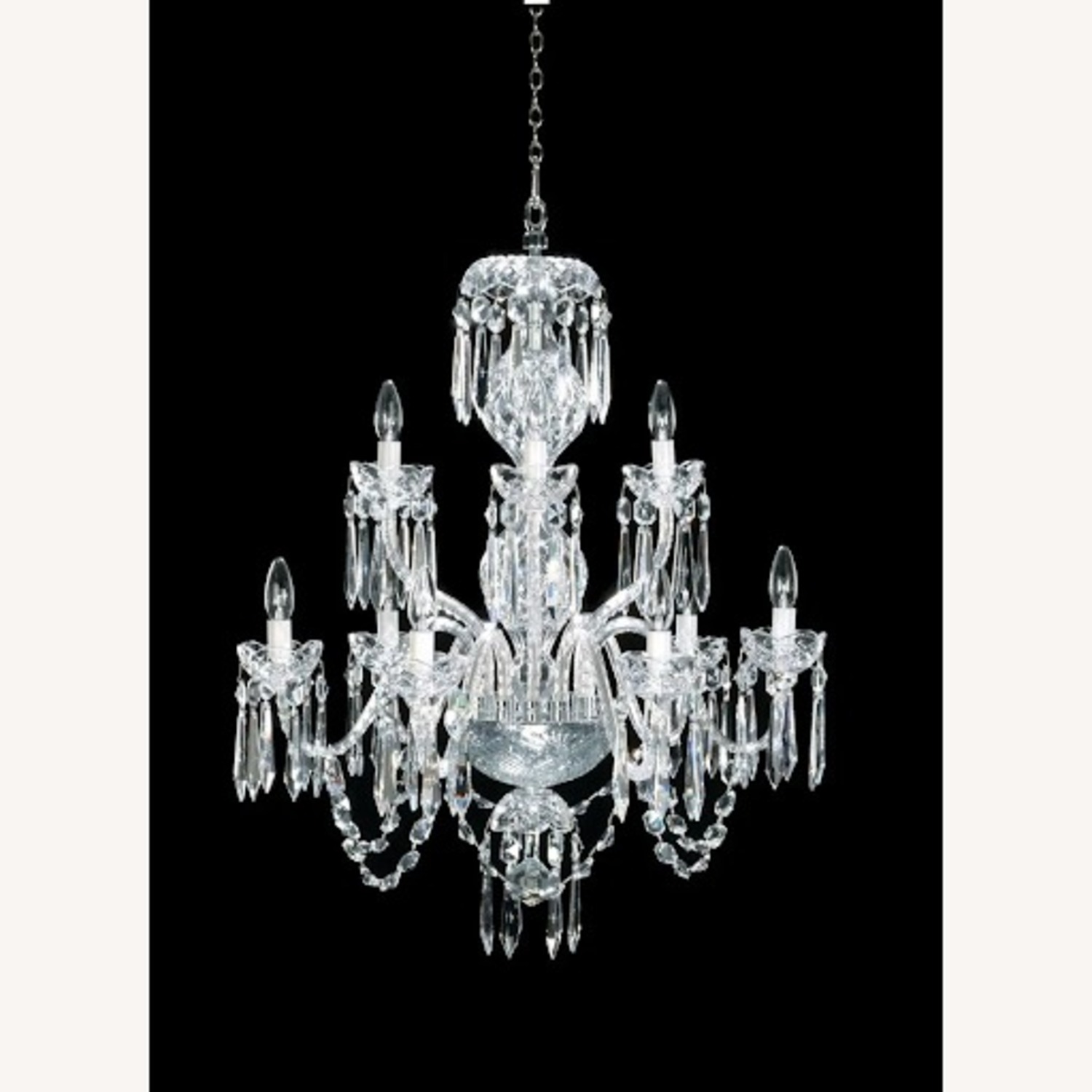 Seller's Notes:Magnificent Waterford Crystal Cranmore Chandelier - 9 Arms, 2-Tier Design This exquisite Waterford crystal chandelier from the Cranmore collection showcases the brand's renowned craftsmanship across two elegant tiers. The majestic 9-arm design features Waterford's signature brilliant-cut crystal, creating an extraordinary display of light and sparkle. Each crystal element catches and refracts light, casting enchanting prismatic effects throughout your space. Dimensions: 30" height x 28" width Condition: Pristine, in original packaging A true statement piece that combines traditional crystal artistry with timeless design, this chandelier would make a stunning focal point in a grand foyer, formal dining room, or luxury living space. Truly an heirloom to pass on to future generations.