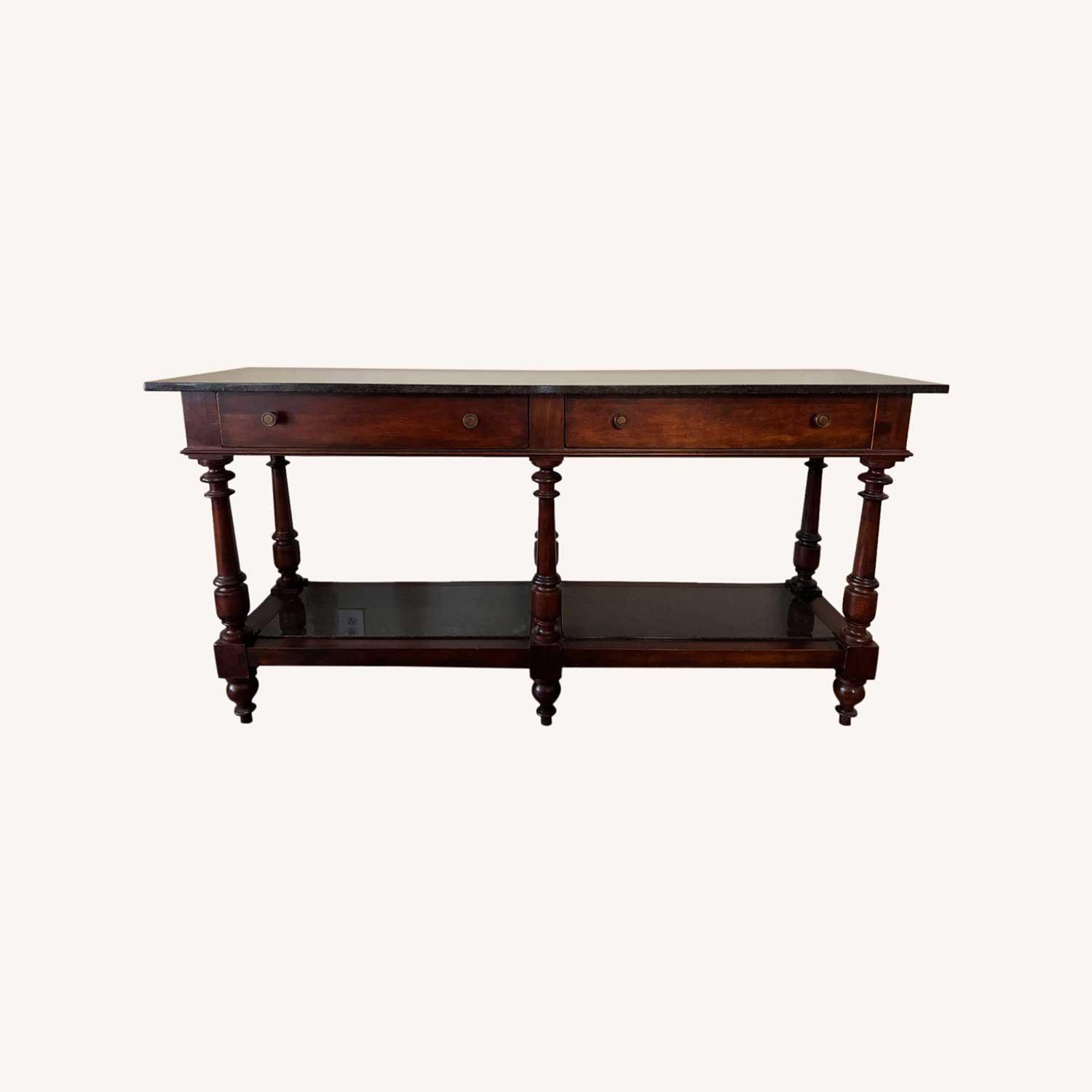 Seller's Notes:This beautiful Acquisitions by Henredon marble top table was purchased 20+ year ago and is in impeccable condition. The marble and wooden piece has two large drawers, one for silverware and one for other serving platters. The marble is a dark gray and black which is complimented by the darker wooden tones. Been with one family and has been upkept beautifully.