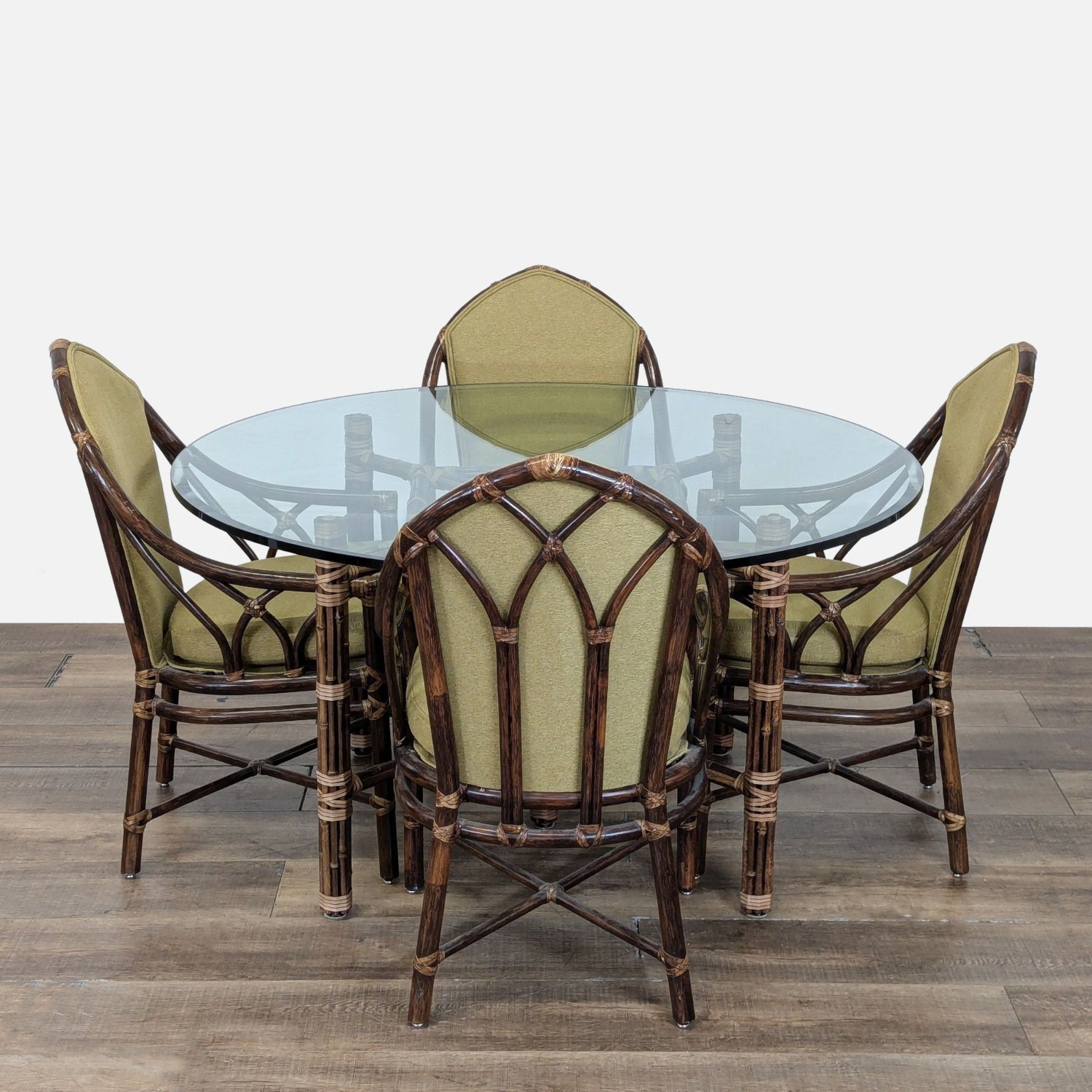 Seller's Notes:The bamboo pieces are lashed together with John McGuire's patented leather strap design. Topped with thick round glass with a beveled edge.