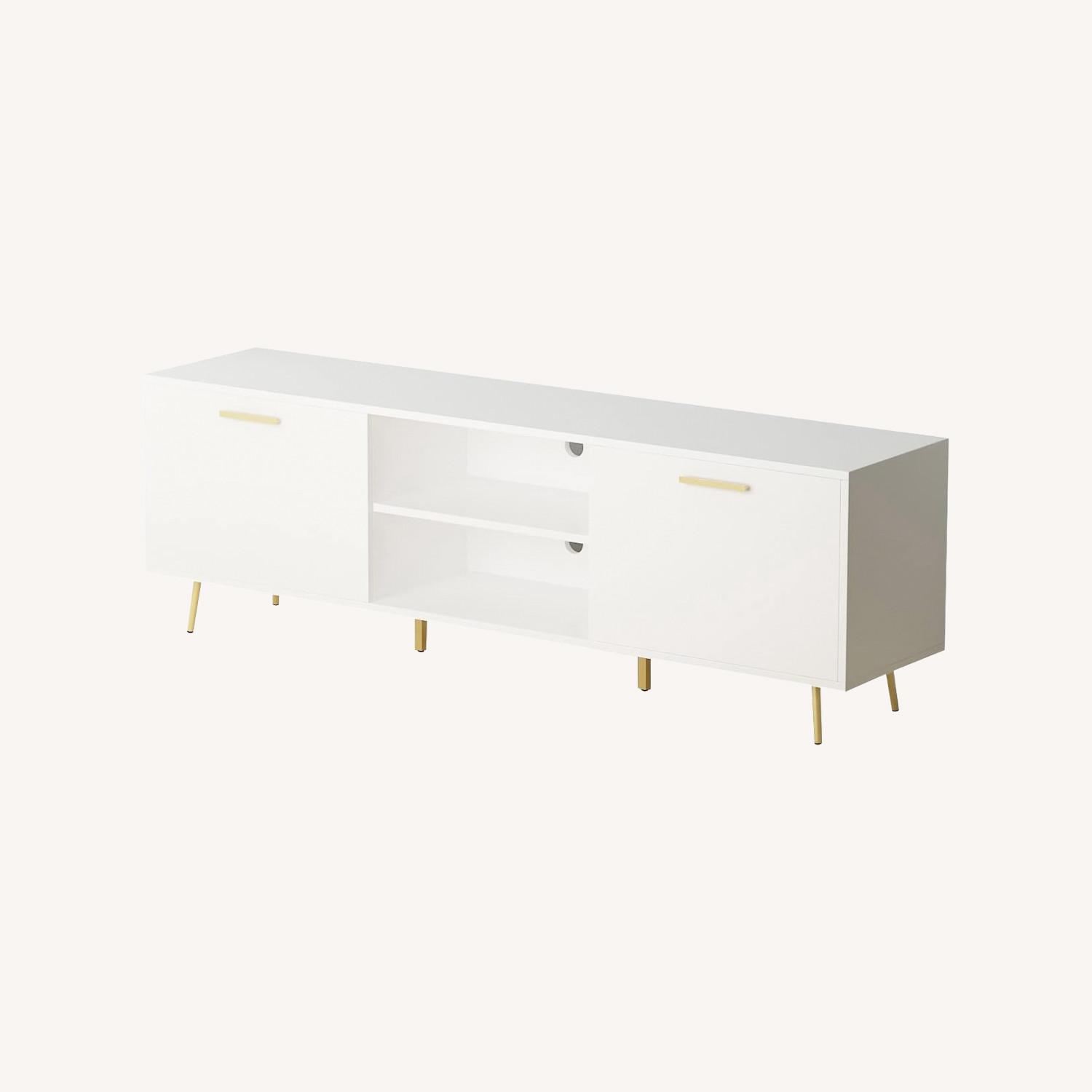 【Ample Storage Space】 This white TV stand features spacious tabletop, 2 tier open shelves and 2 cabinets with 2 doors. There is sufficient space for TV, cable box, DVD, CDs, plants, decorative crafts and so on. Overall dimensions: 69”L x 15.6”W x 22.4”H