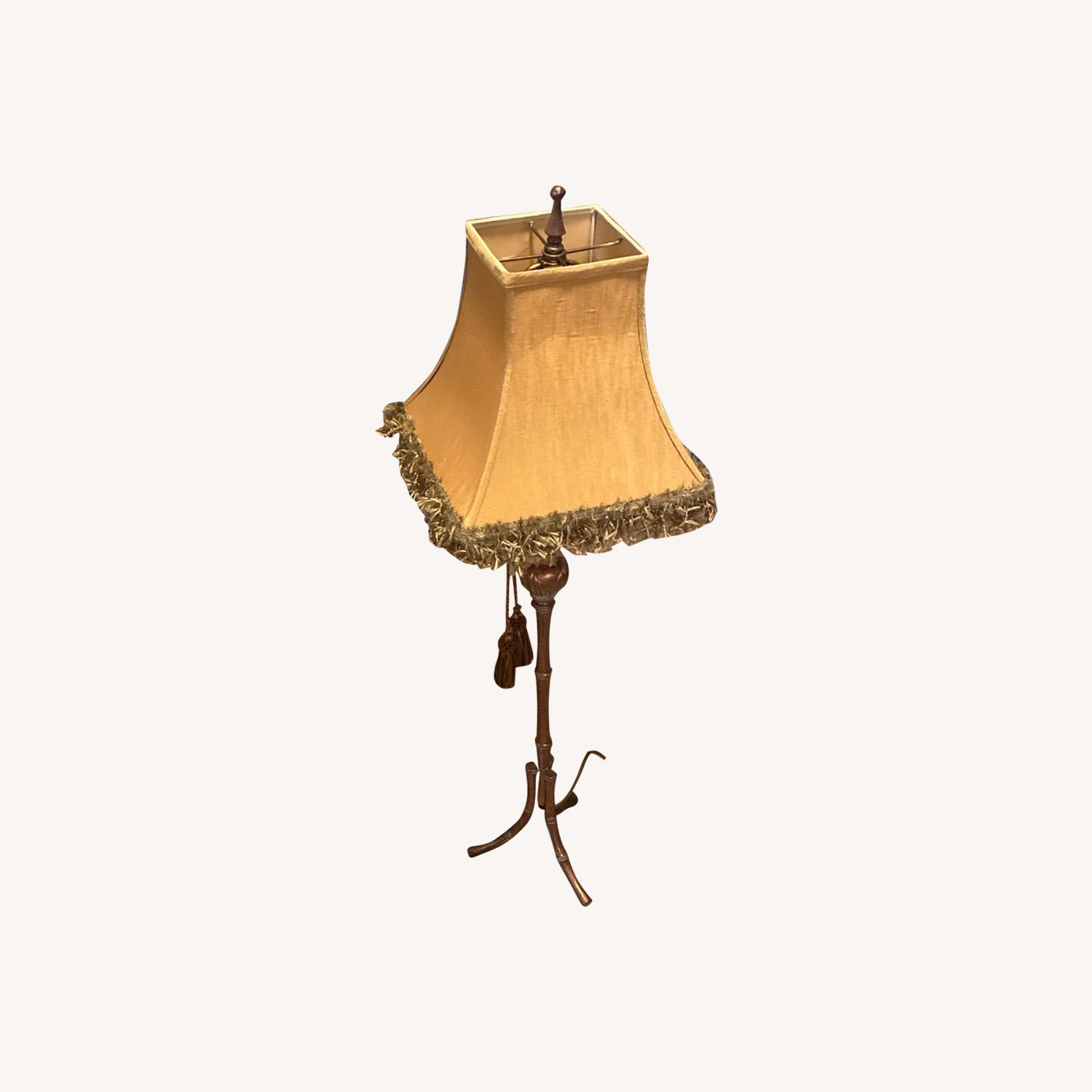 Seller's Notes:Beautiful set of two vintage faux-bamboo floor lamps with elegant gold silk-look shades. These lamps bring a warm, classic charm to any space — perfect for eclectic, Hollywood Regency, cottage, or boho-inspired interiors. Features: • Faux bamboo style bases in warm wood tone • Sculpted tripod-style feet for stability and character • Gold fabric bell shades with decorative fringe trim • Matching finials and tassel accents for a refined, finished look • Original cords present Condition: Both lamps are in good vintage condition. Light wear consistent with age (please see photos). Shades are intact and free of major damage. Lamps power on — as with any vintage lighting, a rewiring is recommended for long-term safety.