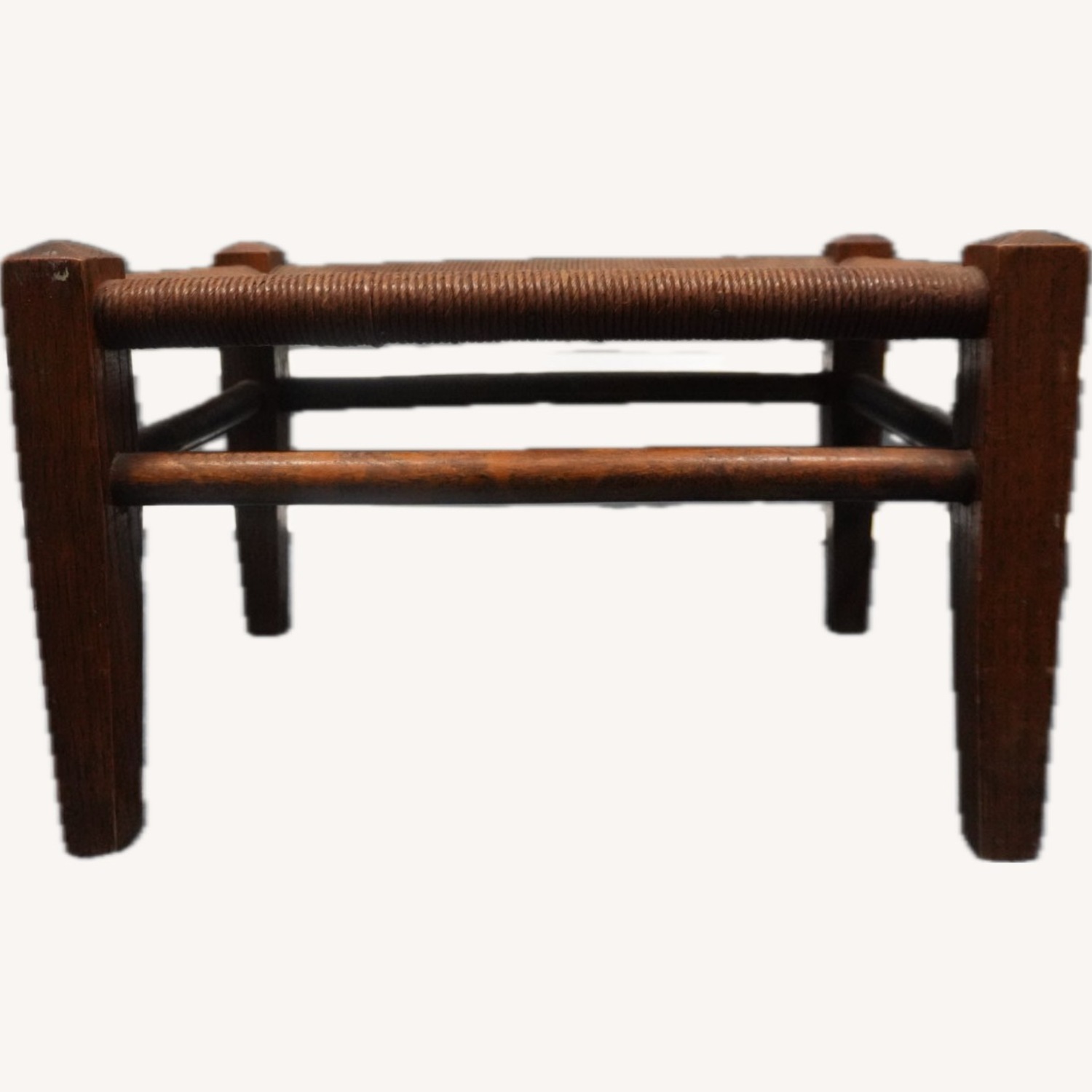 Seller's Notes: Beautiful vintage rush-woven footstool with a solid wood frame and hand-wrapped seat in a geometric weave. Warm patina, simple clean lines, and artisan craftsmanship give this piece a timeless cottage-meets-Scandi feel. Perfect as a footstool, plant stand, low table for a stack of books, or accent in a cozy reading nook, nursery, or entryway. Lovely textural detail and classic rustic charm. Details Material: Solid wood frame + woven rush seat Style: Rustic / Cottage / Farmhouse / Scandinavian Folk Era: Vintage Finish: Warm medium wood tone Condition: Good vintage condition, beautiful patina; minor wear to the rush consistent with age (see photos) Why You'll Love It Hand-crafted character Neutral, natural texture Perfect accent piece — small but stylish Works great layered with plants, baskets, and blankets