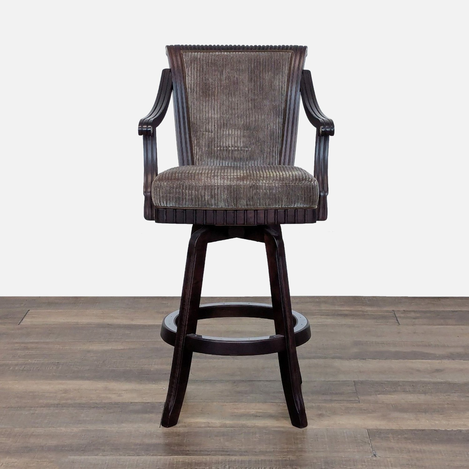 Seller's Notes:Handcrafted, the bar stool is made of selected American maple hardwoods using a 12-step state-of-the-art finishing process used to achieve the rich finish. Ornate hand-carved elements grace the arms, rolled back, and seat base.