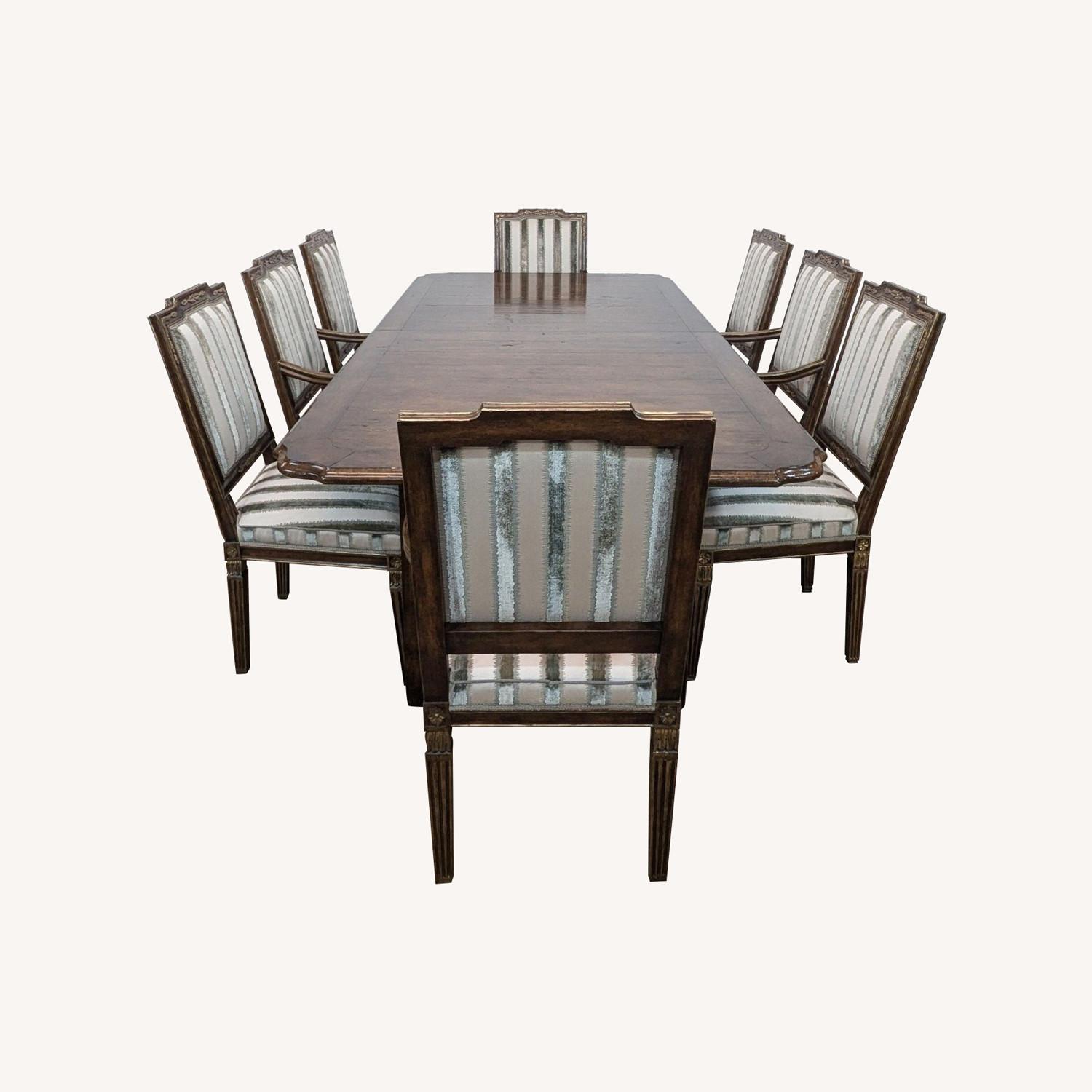 Seller's Notes:Walnut Wood dining table with 2 inserts that expand the table 34”. Includes Minton-Spidell dining chairs: 4 side chairs and 4 arm chairs.