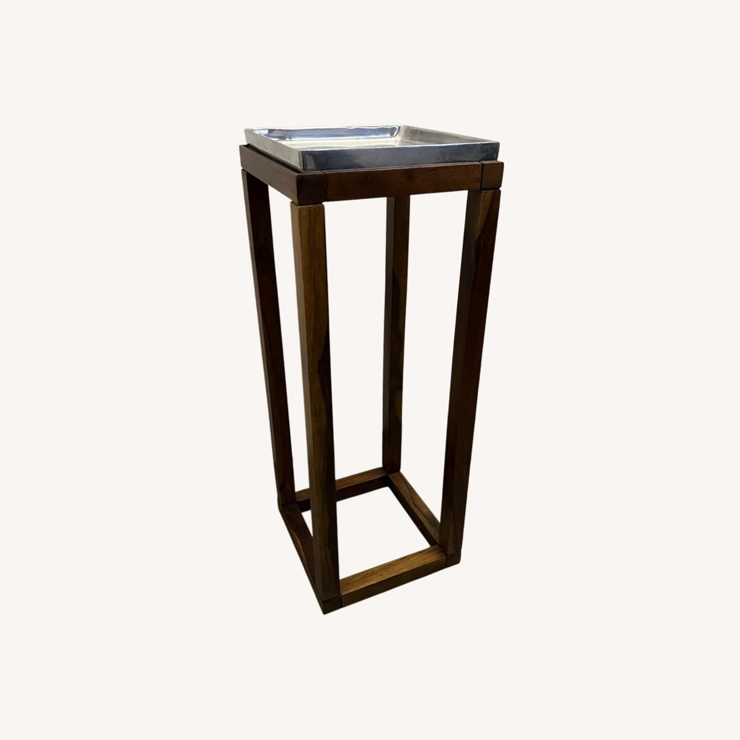 Seller's Notes:Beautiful modern wood and metal accent table. Can be used as a drink table or plant stand as pictured. Wooden Base: Solid walnut built using traditional woodworking joinery. Finished with a blend of mineral oil and beeswax for a smooth and buttery feel. Metal Top: Chrome Finish, Solid Metal. Metal top is removable. • Width: 10 " • Depth: 10 " • Height: 27 "