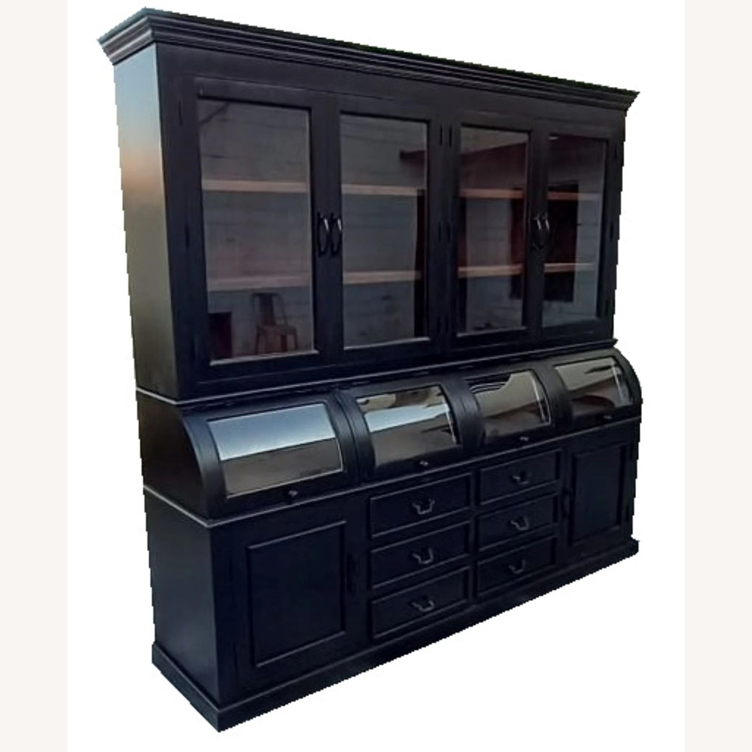Seller's Notes:This Modern Farmhouse kitchen pantry is a large cupboard crafted from solid wood, featuring a glass door china display showcase and a 2-piece hutch with curved glass and a black bread cabinet. Dimensions: 84″ W x 84″ H x 22″ D Our pieces are vintage, antique, or previously owned furniture and décor. As such, normal wear consistent with age and use should be expected and is part of each item’s character and charm. We make every effort to represent items accurately through detailed descriptions and photographs. However, condition and overall aesthetic can be subjective. We encourage buyers to carefully review all images and reach out with any questions prior to purchase to ensure confidence in their selection.