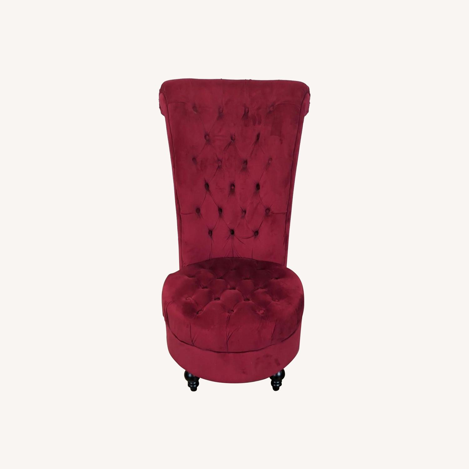 Seller's Notes:Features red velvet upholstery with diamond tufting and turned wood legs.