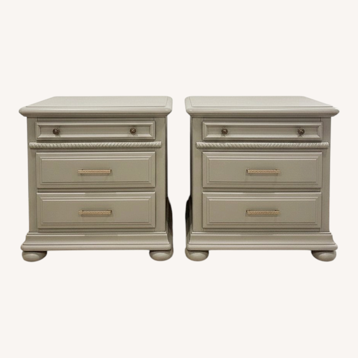 Seller's Notes:Newly refinished matching pair of solid wood (pine) oversized nightstands made by Timbercrest furniture. They have been cleaned, sanded, and hand painted in a modern Sage green and sealed with polyurethane. All drawers open and close very well, all of them are on me fail rails with stopping mechanism in place so they don’t come out fully when pulled! All drawers are in like new condition and extremely clean, they have been scrubbed clean and polished with a lemon oil meant for drawer refinishing. I replaced all handles with brand new antique brass pulls. Added felt pads to the bottom of all the bun feet to protect the floors. This set is in excellent shape but as with any refinished furniture, minor imperfections are to be expected. 27”L x 18”D x 27”H A part of the proceeds will be donated