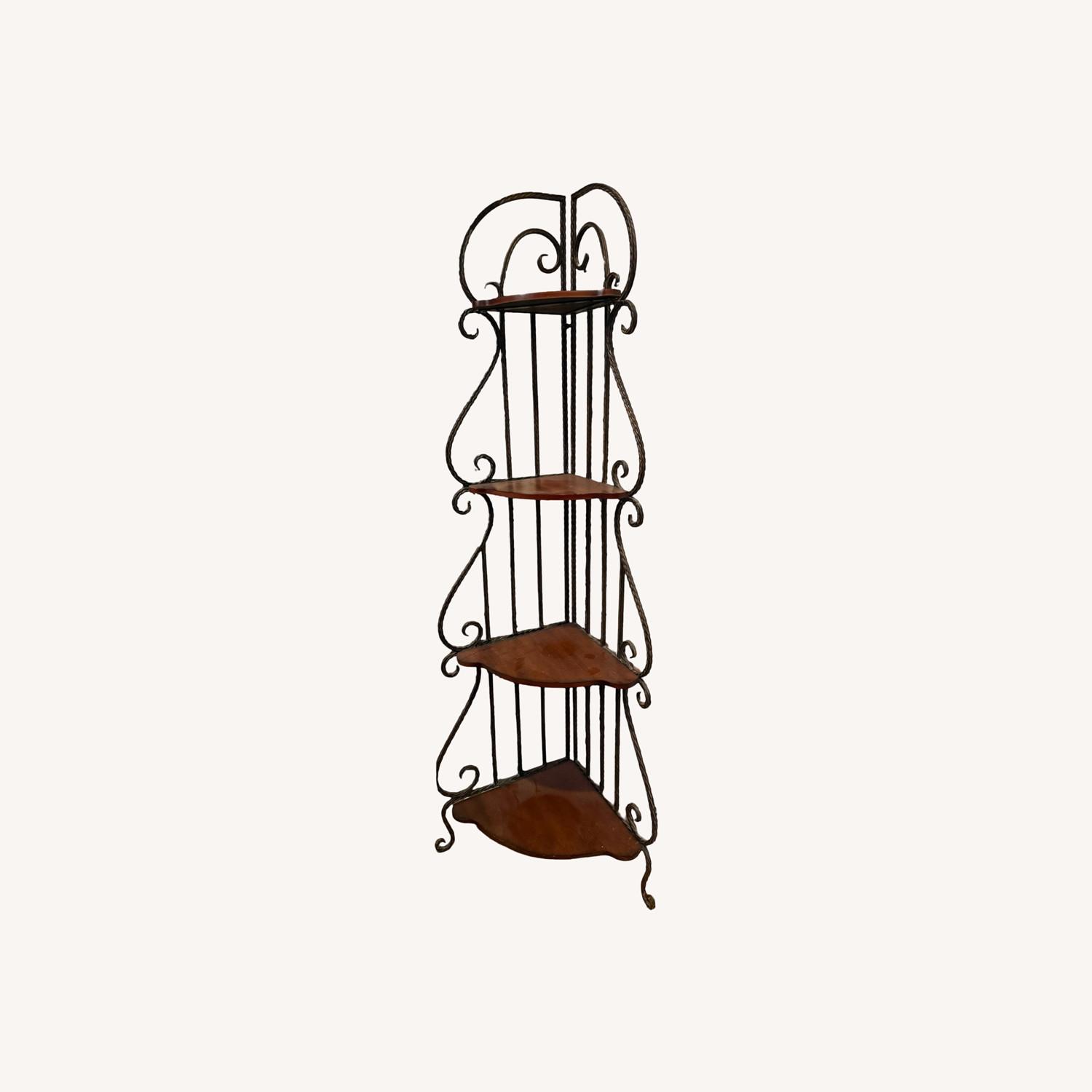 Seller's Notes:Elegant wrought iron corner shelf featuring decorative scrollwork and five wooden corner shelves, perfect for adding vertical storage and visual interest to any room. The curved iron frame and warm wood shelves create a classic, vintage-inspired look that works well in traditional, farmhouse, or eclectic interiors. Designed to fit neatly into a corner, this piece is ideal for displaying plants, books, collectibles, framed photos, or decorative accents while saving floor space. The iron structure provides excellent stability, and the shelves are solid and functional. Condition: Good pre-owned condition. Minor surface wear on the wood shelves consistent with normal use. Structurally sturdy and stable. Features: • 5-tier corner shelf design • Wrought iron frame with decorative scroll details • Solid wood shelves • Space-saving vertical storage • Classic / vintage style Perfect for: • Living room or bedroom • Entryway or hallway • Bathroom or kitchen storage • Plant or décor display