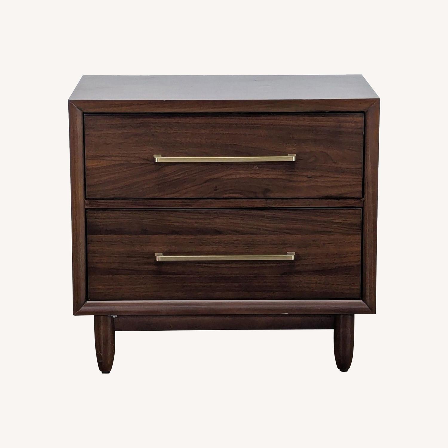 Seller's Notes:This mid-century modern nightstand features clean lines and a classic color palette. Made from hardwood solids and walnut veneers, it has a rich finish. Four tapered legs provide sturdy support, while the two spacious drawers offer ample storage. The drawer pulls are brass.