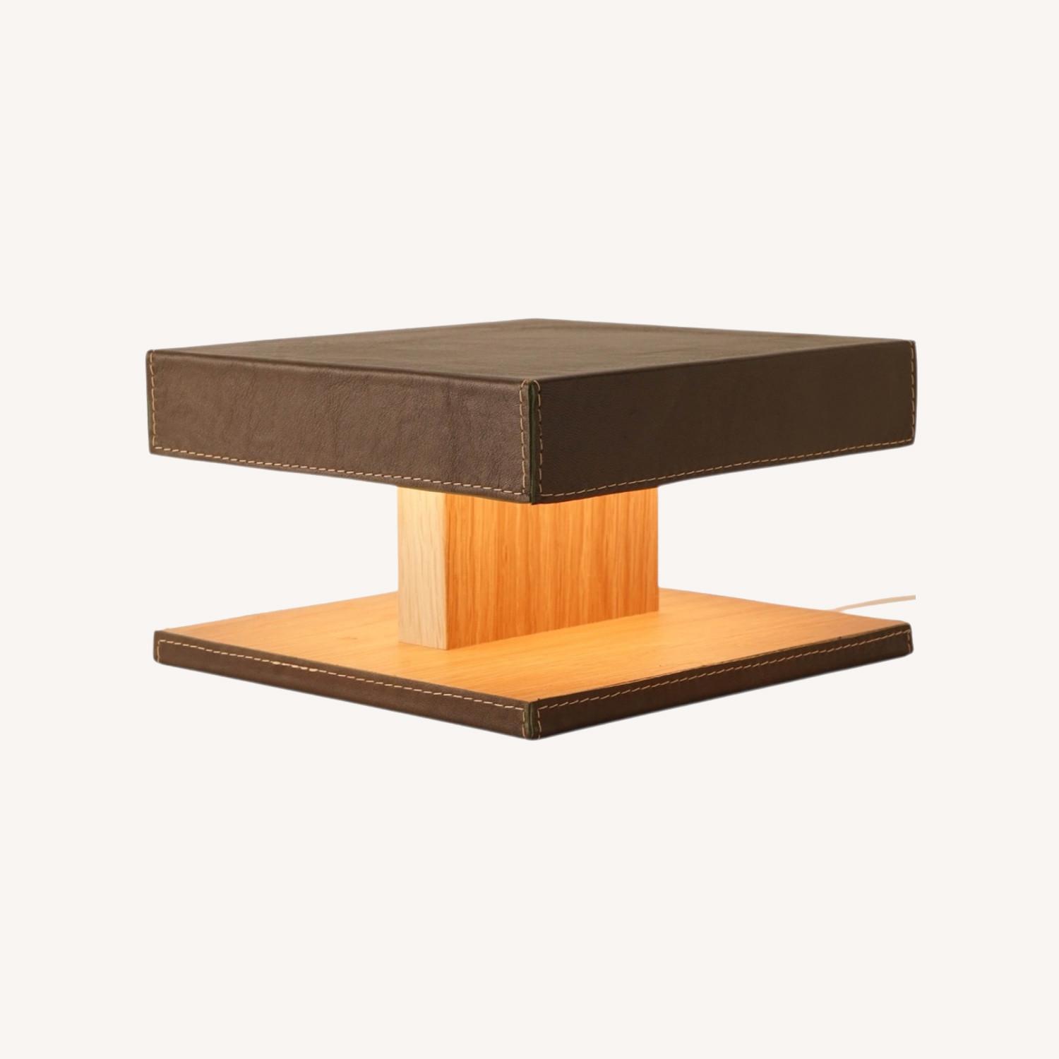 Seller's Notes:This small table lamp is perfect for an office, library, or bedroom. Clad in full grain leather, an on/off switch and standard US plug makes setting up simple. Shown in Olive leather and White Oak. Designed and handmade in Hunterdon County, New Jersey. Dimensions: 8" length x 8" width x 5.5" height. 3500K LED with switch and standard US plug. Finish: Shown in Olive Leather with contrasting stitch and White Oak base, other colors available.