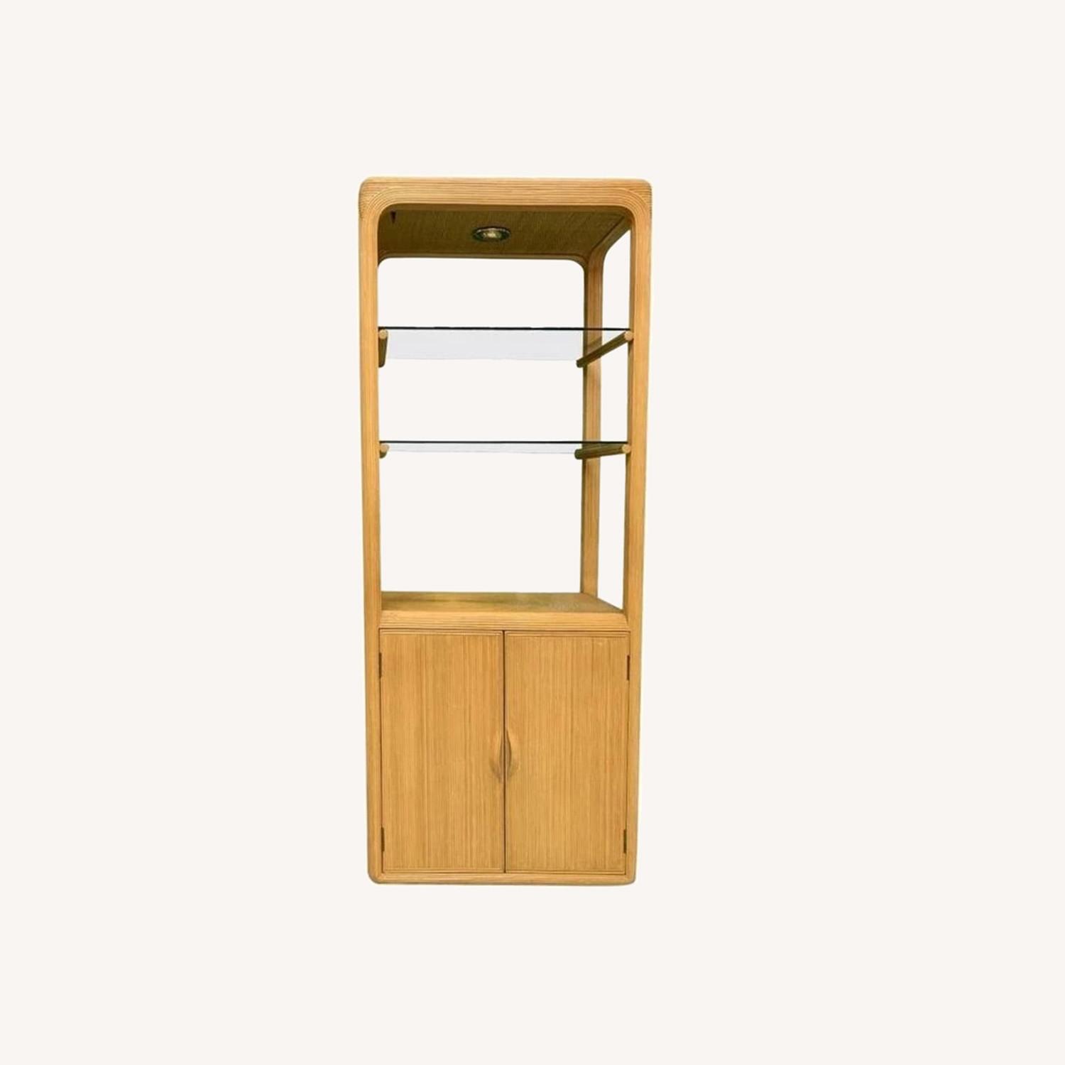 Seller's Notes:Matched Pair of Pencil Reed Etageres in the Style of Gabriella Crespi This pair of matching wall units each has two glass shelves and two lower doors opening to a fixed shelf. Each cabinet has a recessed light on top with a push button on/off switch. The units are covered with split pencil reed rattan and have a sunburst design on the top of the lower cabinet. We also have listed the matching dining table. Measures 30 1/2" wide, 18 1/2" deep and 75 3/4" tall.