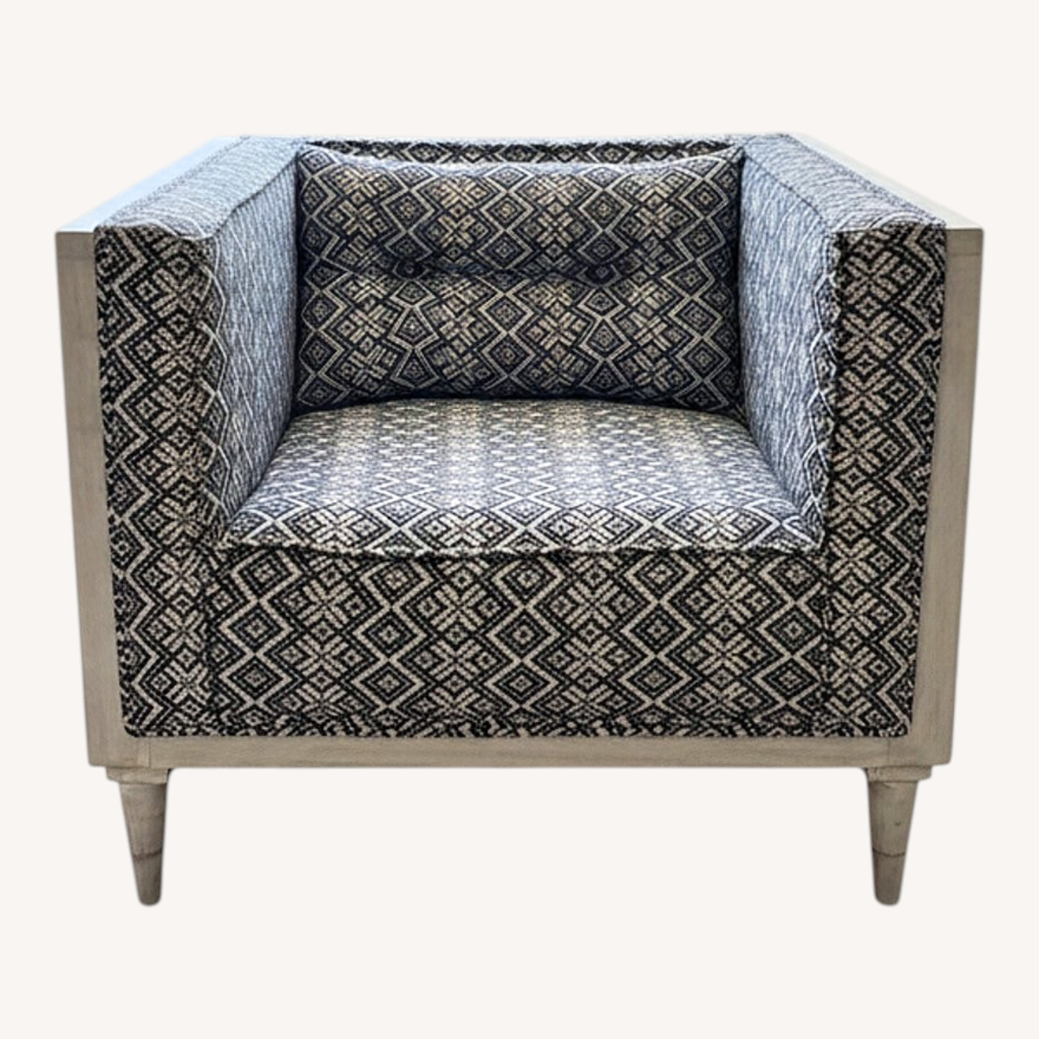 Seller's Notes:• Color: Black/white patterned fabric + white frame • Stylish accent chair with geometric pattern. Super comfortable and very structurally solid. No rips/tears and fabric is in great shape. • Dimensions (approx): ~35" W x ~35" D x ~30" H • Moving note: Easy to move but bulky—1 strong person or 2 people recommended. Message me to arrange pickup. • Pet-free and smoking-free home. Condition: Used - Good (see photos). Time in use: 5 years