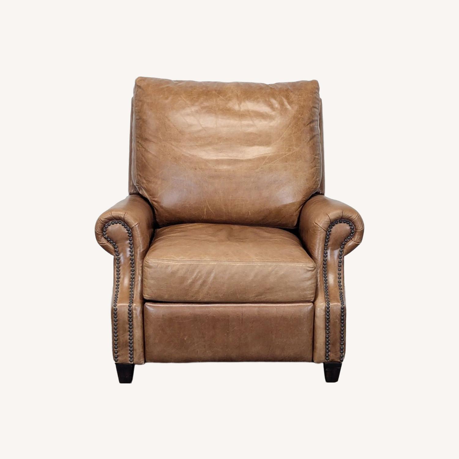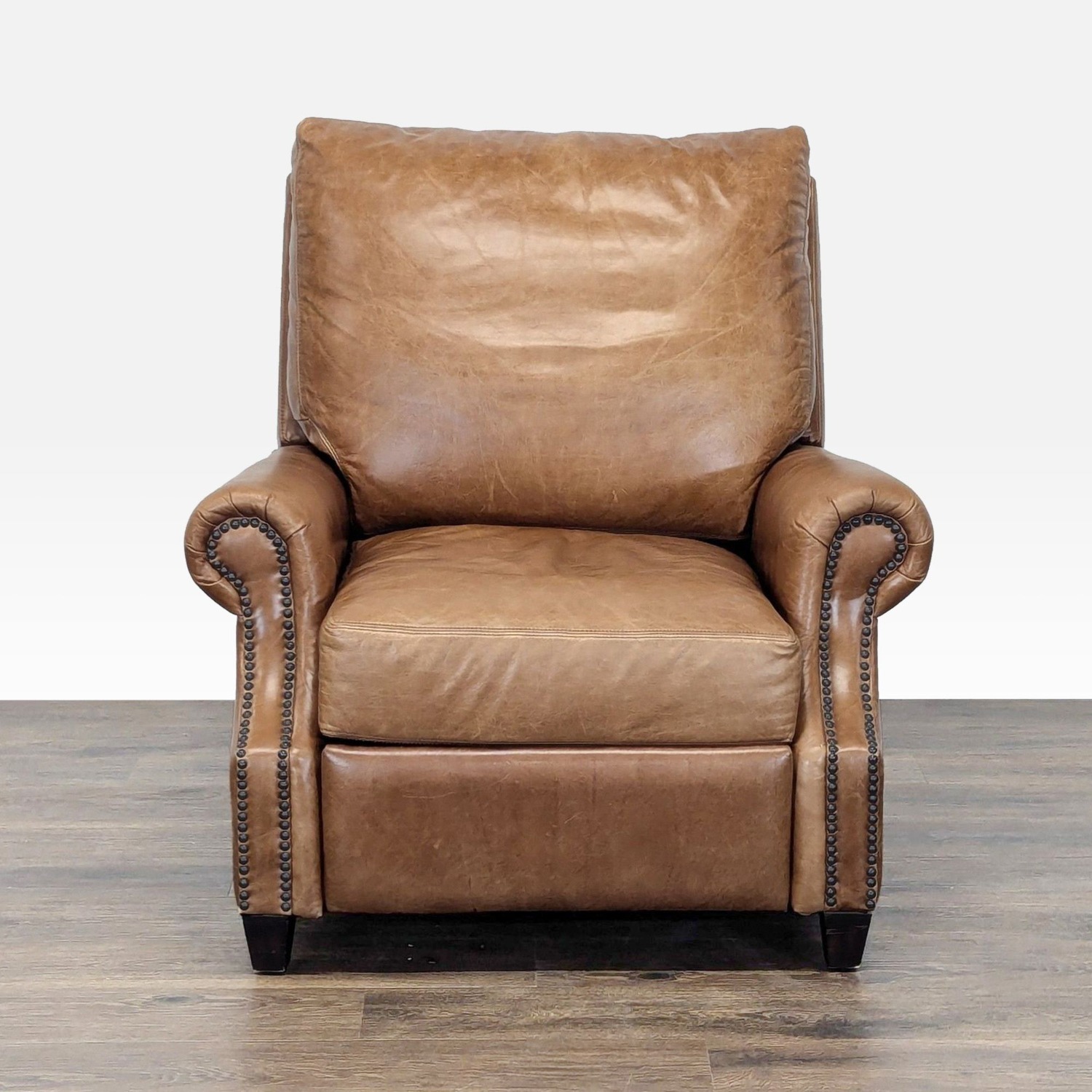 Seller's Notes:This Pottery Barn lounge chair features rich brown leather, classic rolled arms with nailhead trim, and a smooth reclining mechanism for maximum comfort. Perfect for relaxing in style and adding a touch of elegance to any living space. Durable and supportive, ideal for everyday use.