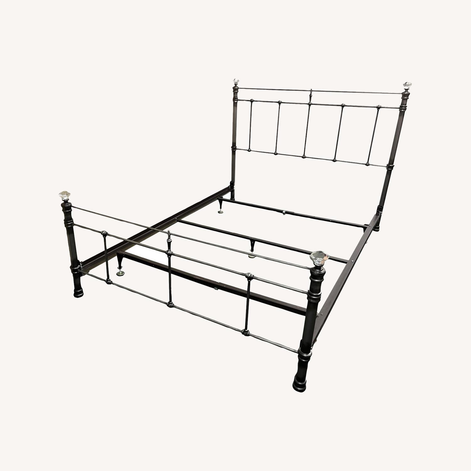 Seller's Notes:Pottery Barn Queen Size Claudia Bed Frame by Pottery Barn. A vintage style wrought iron bed frame. At each corner of the bed is a clear glass prism finial, jewels of the bedroom. Supported with three horizontal support beams. Visible and minor distress from usage + age. Gorgeous addition to any bedroom!