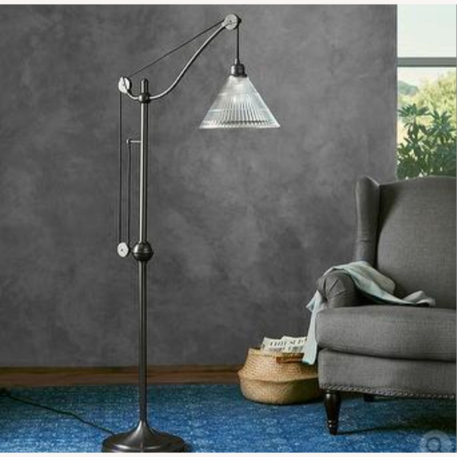 Bodhi Task Floor Lamp Designed after a found antique, the Bodhi Collection is a whimsical take on task lighting. The industrial-inspired iron base has a bronze finish, and a pulley system on this floor lamp allows it to adjust smoothly