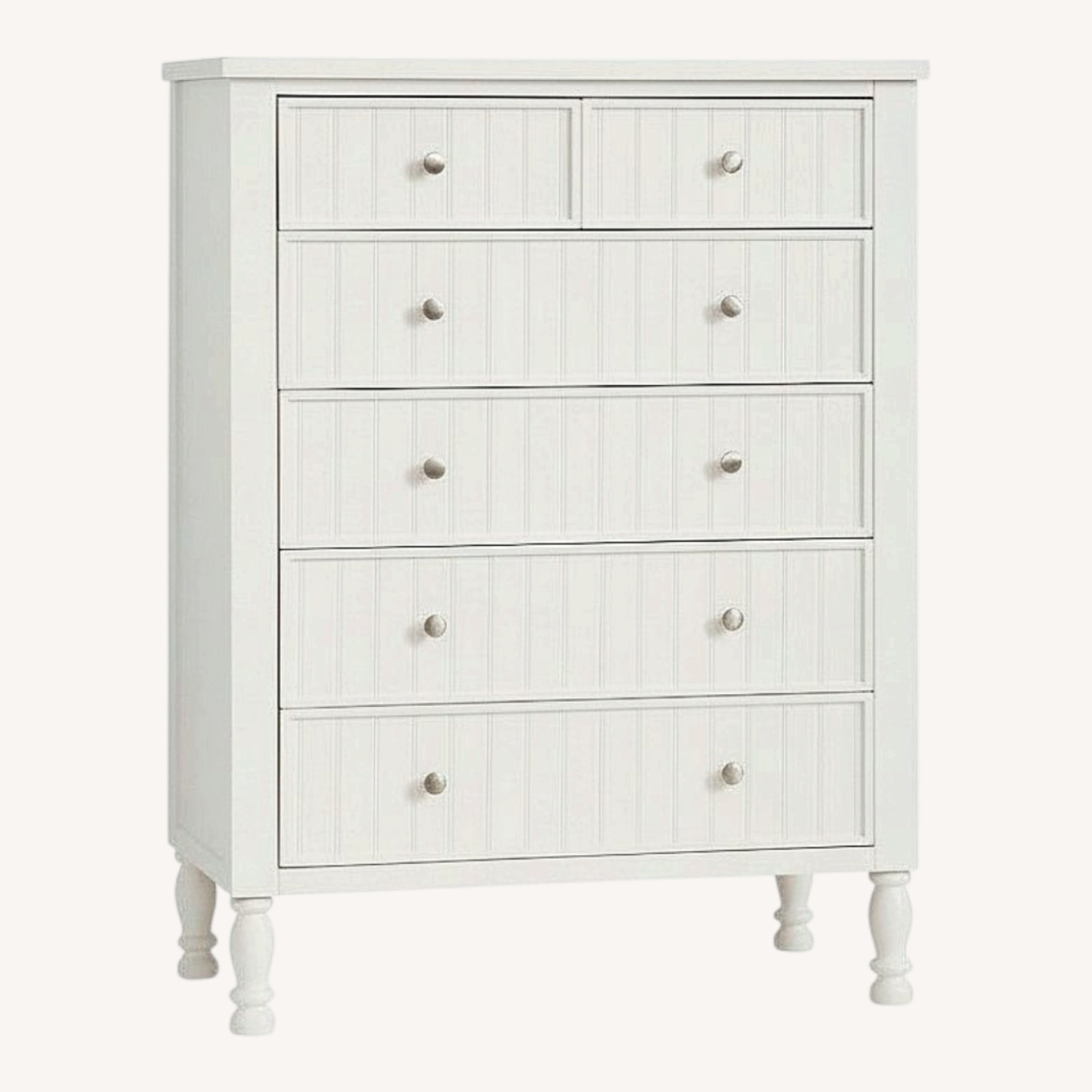 Seller's Notes:Clean lines and charming details make the Catalina Collection as versatile as it is beautiful. Featuring four spacious drawer and two smaller ones, this drawer chest is accented with lathe-turned legs, beadboard paneling and metal knobs. It’s expertly crafted from durable kiln-dried wood, and it’s GREENGUARD Gold Certified to contribute to healthier indoor air, keeping you and your family safer. Purchased in July 2024. Minor scratches and stains (see pictures).