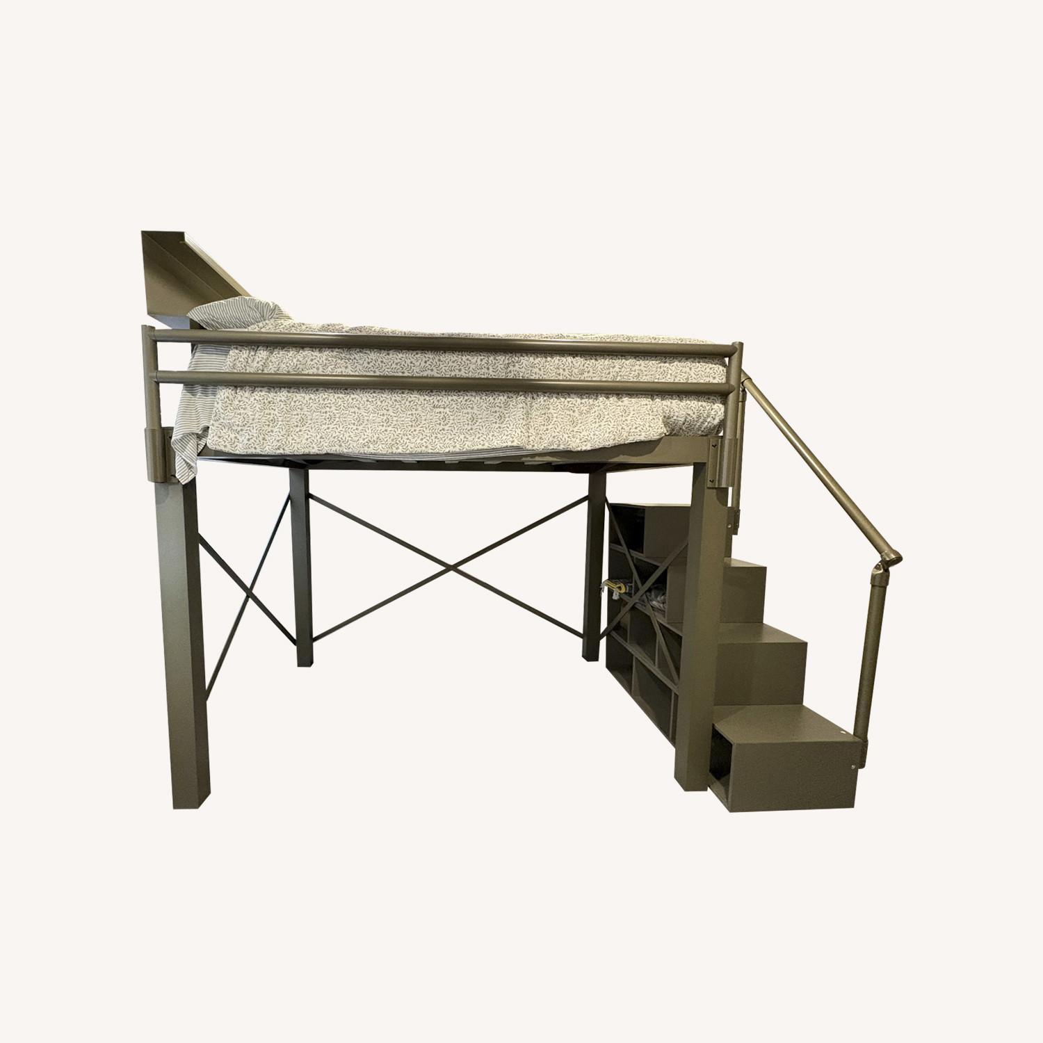 This heavy-duty queen bed frame was custom made by Francis Lofts & Bunks, an American brand. It's material is American aluminum and it's color is listed as Light Bronze on their website, but it leans towards a beautiful deep green under certain lighting. It's built for a 9ft ceiling. More information about the dimensions of the frame and accessories can be found at: https://adultbunkbeds.com/loft-beds/queen-loft-bed